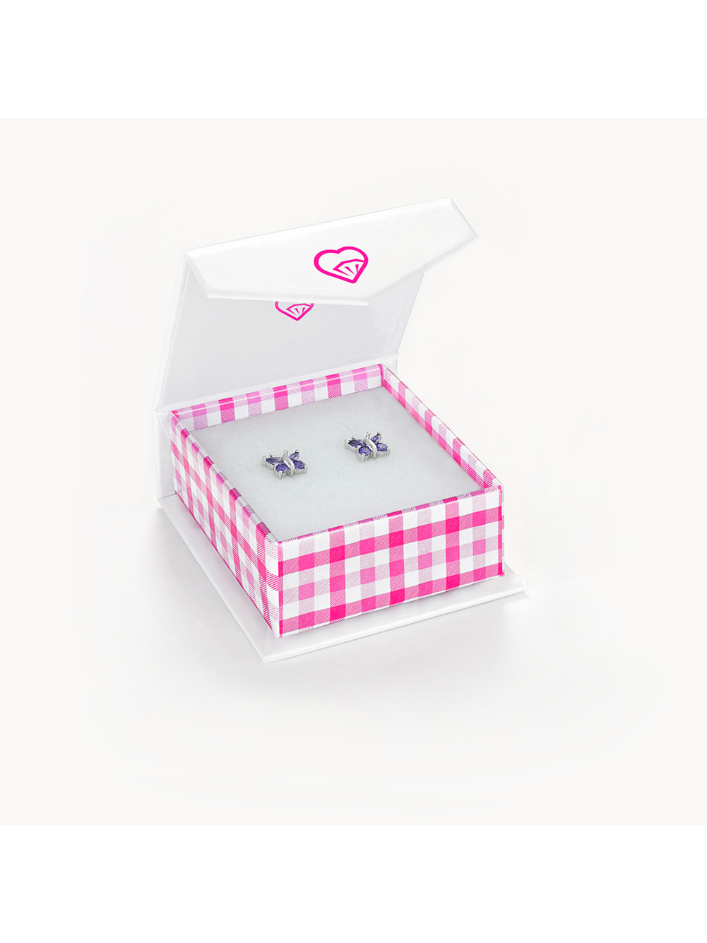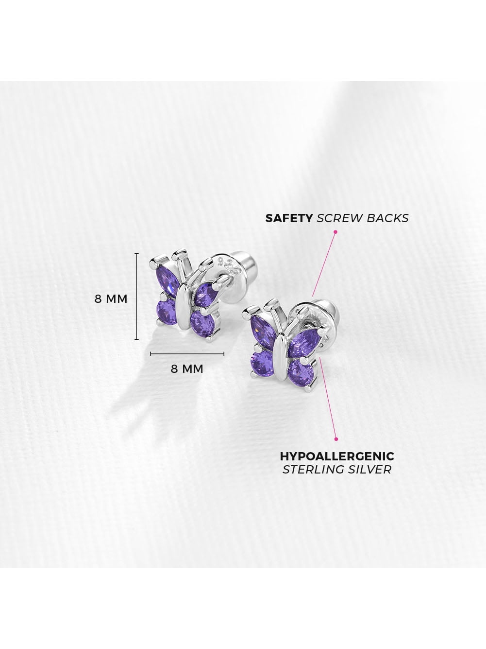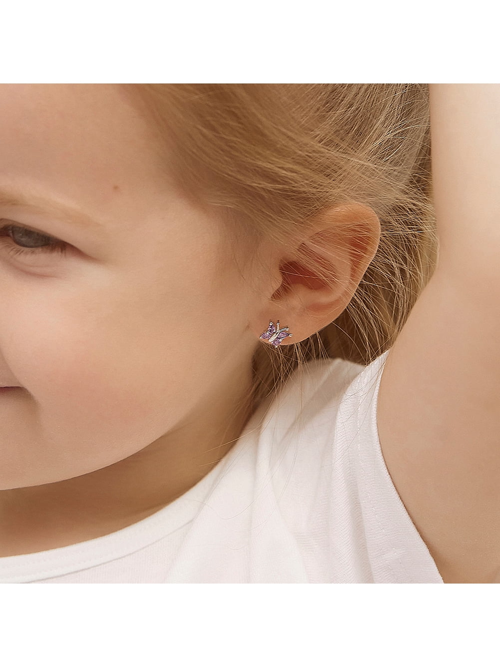 - DETAILS: She is sure to find her wings with these charming purple butterfly earrings. Beautifully wrapped in a trendy and handy gift box, her heart will flutter at the sight of these adorable earrings! Perfect for toddlers and young girls (2-10 years), these cubic zirconia butterfly earrings are perfect for any occasion. Crafted in pure 925 sterling silver, that is naturally hypoallergenic. The posts are threaded and feature a safety screw back design to secure your little one’s earring.