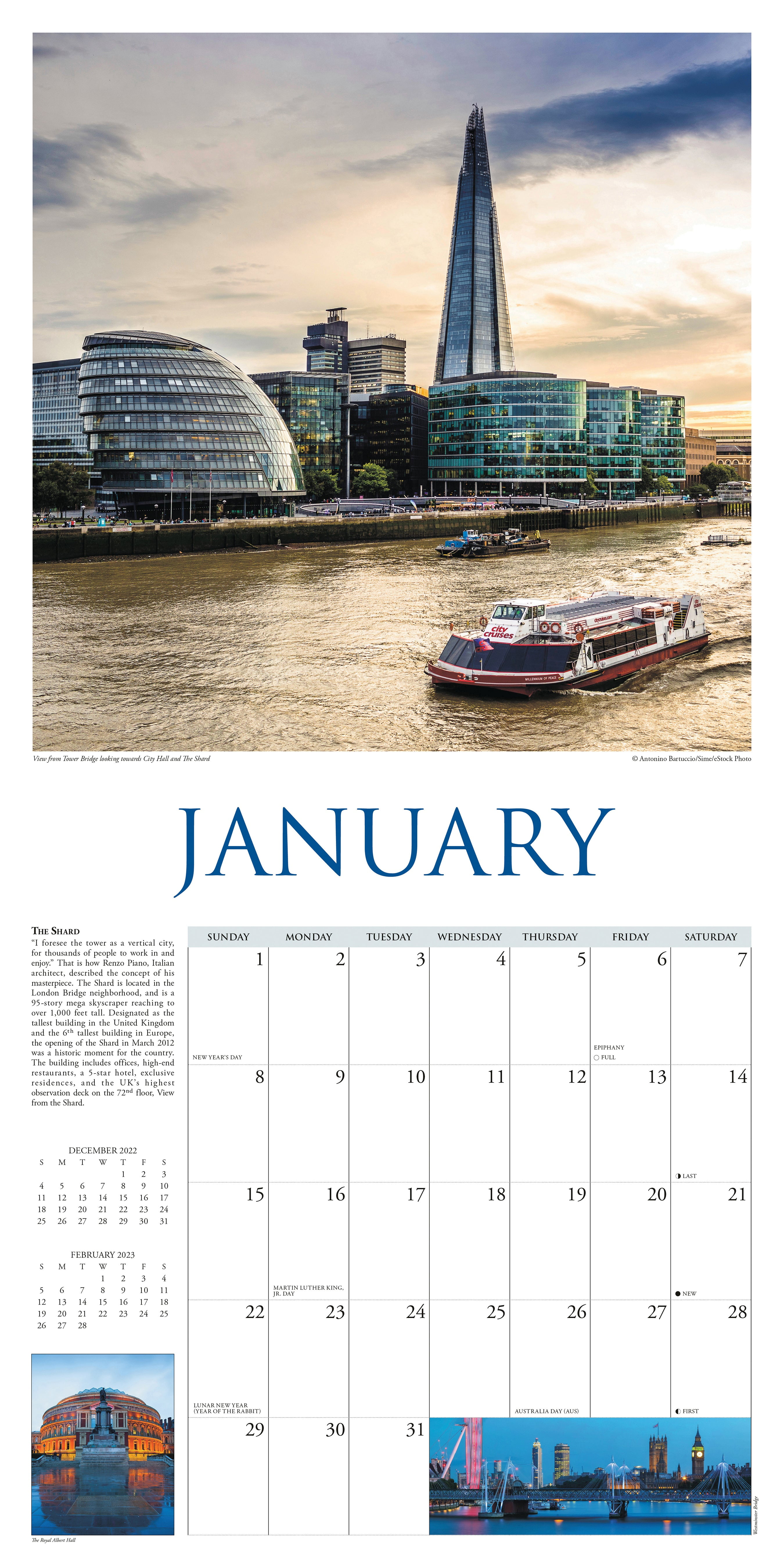 With over 2,000 years of history, London stands at the Prime Meridian and boasts centuries of stunning architecture, renowed museums and world-class theatres. Set your watch to Big Ben and revel in the richness of one of the greatest cities on earth as you stroll along the River Thames to visit Tralfagar Square, Buckingham Palace and the London Eye. The included pocket-sized map features a detailed walking route of a popular neighborhood along with a directory of its sights, shops, restaurants and hotels. Printed with soy-based inks on FSC certified paper, this 12”x 12” wall calendar features 12 large monthly grids that offer ample room for jotting notes, along with moon phases (CST), and standard U.S. and international holidays.