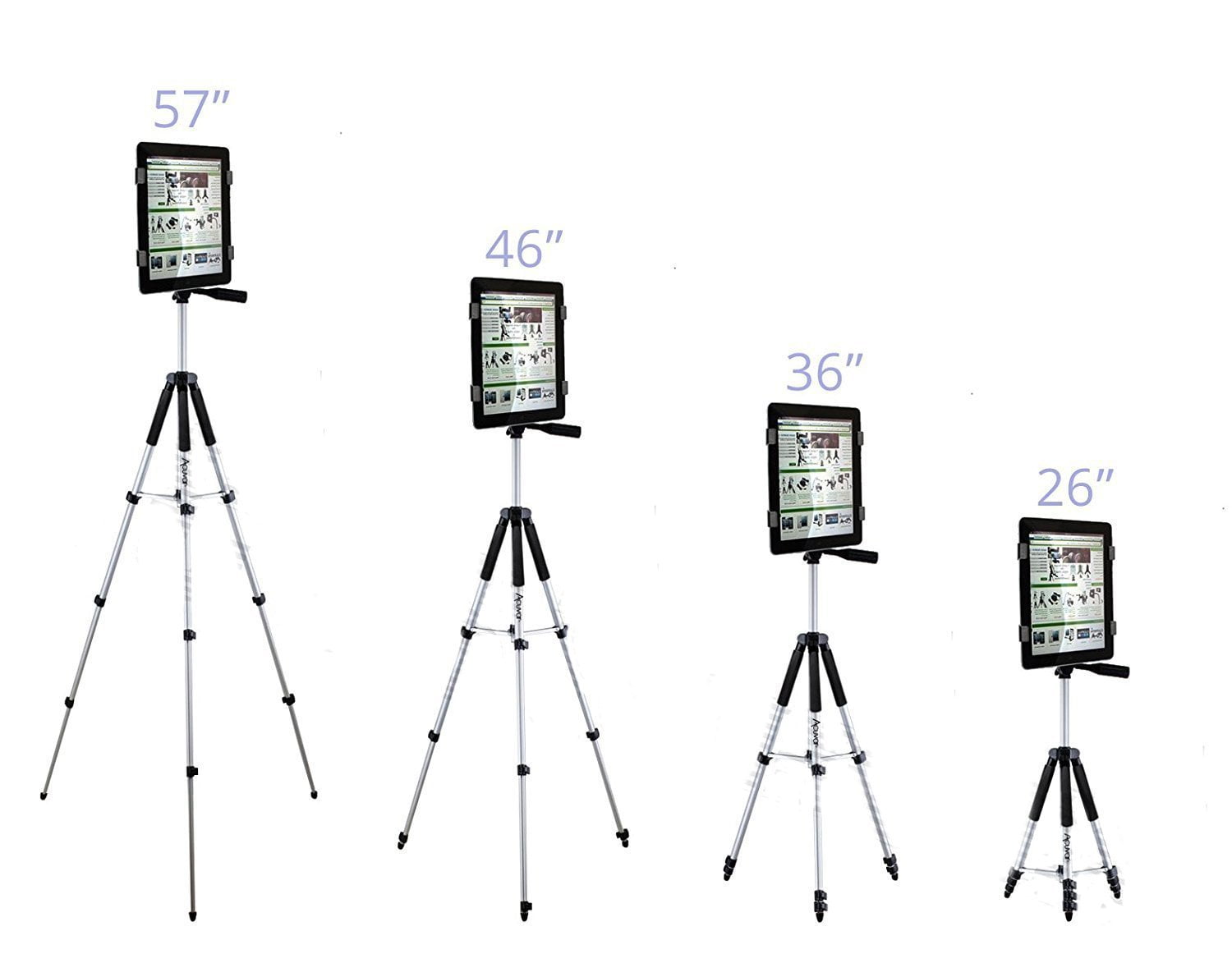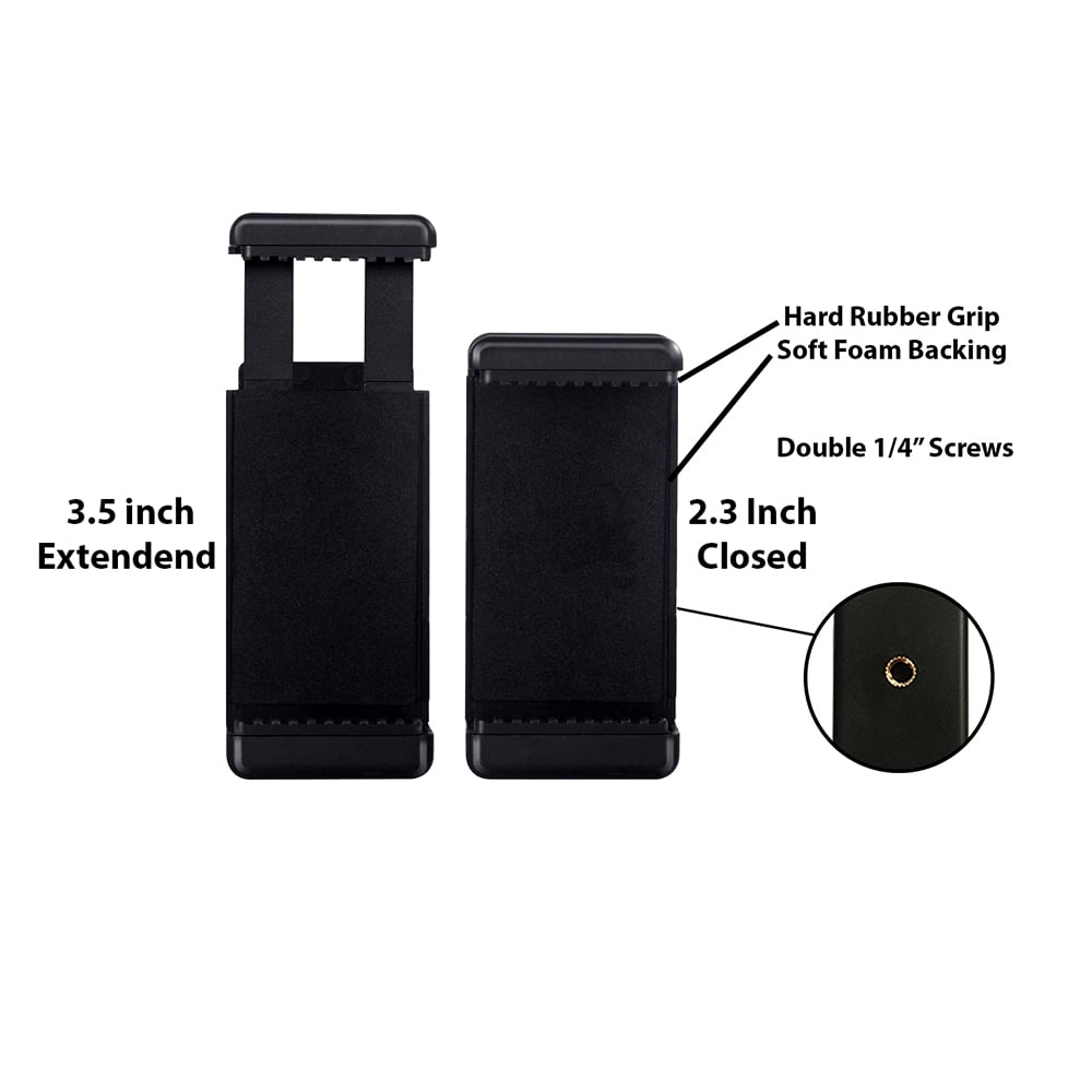 Acuvar Pro Series 57 Inch Tripod non slip feet and a bubble level indicator. adjustable center pole and comes with a water resistant carrying case. lightweight and mobile with its aluminum alloy legs and a 3 way pan head. Tablet Tripod Mount (Universal) Acuvar Universal tripod mount securely screws into all tripods and monopods. Adapter is fully adjustable & fits any tablet & large phone with 5.5 to 9.7 inch screens Perferct for most tablets, including all Apple iPad models (except iPad Pro): Great for iPad 2, iPad 3, iPad 4, iPad Air, iPad Air2, iPad Mini & all Samsung Galaxy Tab models, etc Great for Phablets (large phones): iPhone 6 Plus/6s Plus, Galaxy Note 4, Note 5, Note 6, that has a minimum screen size of 5.5 inches or a device width of at least 3 inches. 7 foam pads keep your device snug and protected. Easy installation. Easy lock. Snug fit for your tablet. Wireless Remote Wireless Remote works for most Androids and Apple iPhone smartphones No app is needed to download With phone connection you can start using your wireless remote Lightweight and easy to keep in your pocket or as a keychain Pictures can be taken up to 30 feet away The universal smartphone Mount fits on any modern smartphone. Smartphone Tripod Mount: Easy attachment & padded grip to avoid cellphone damage