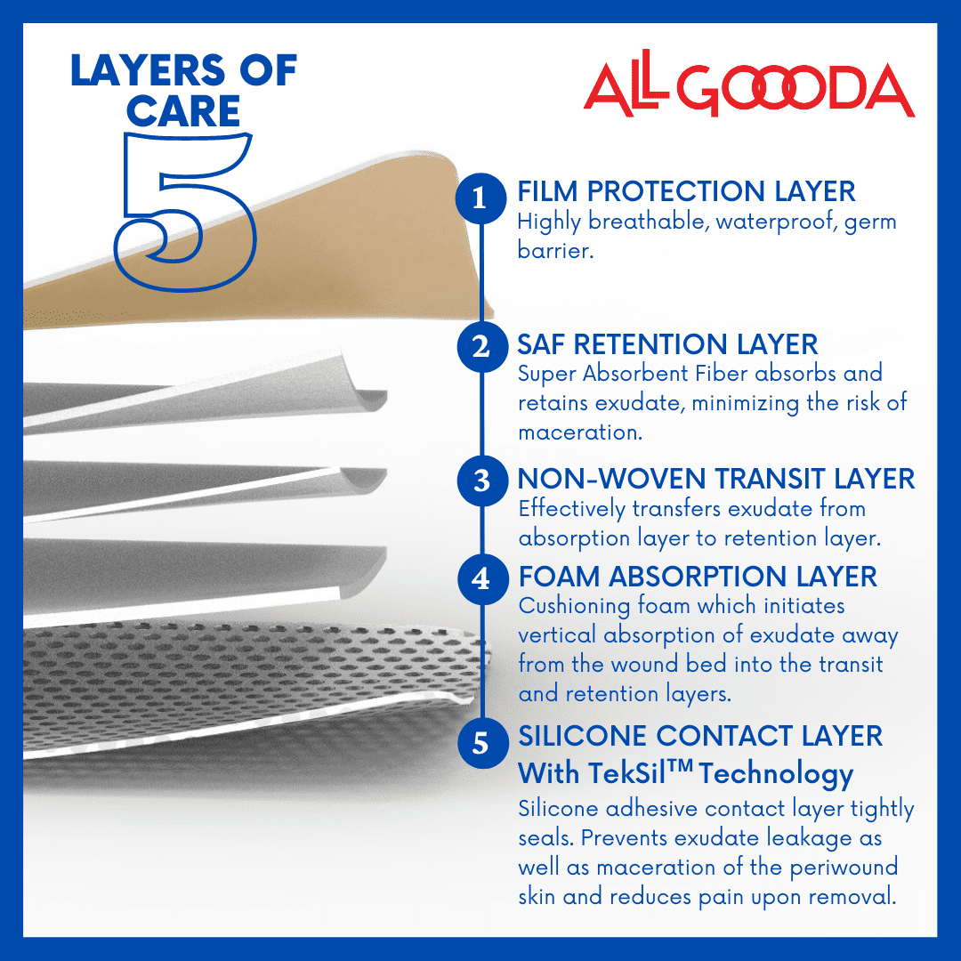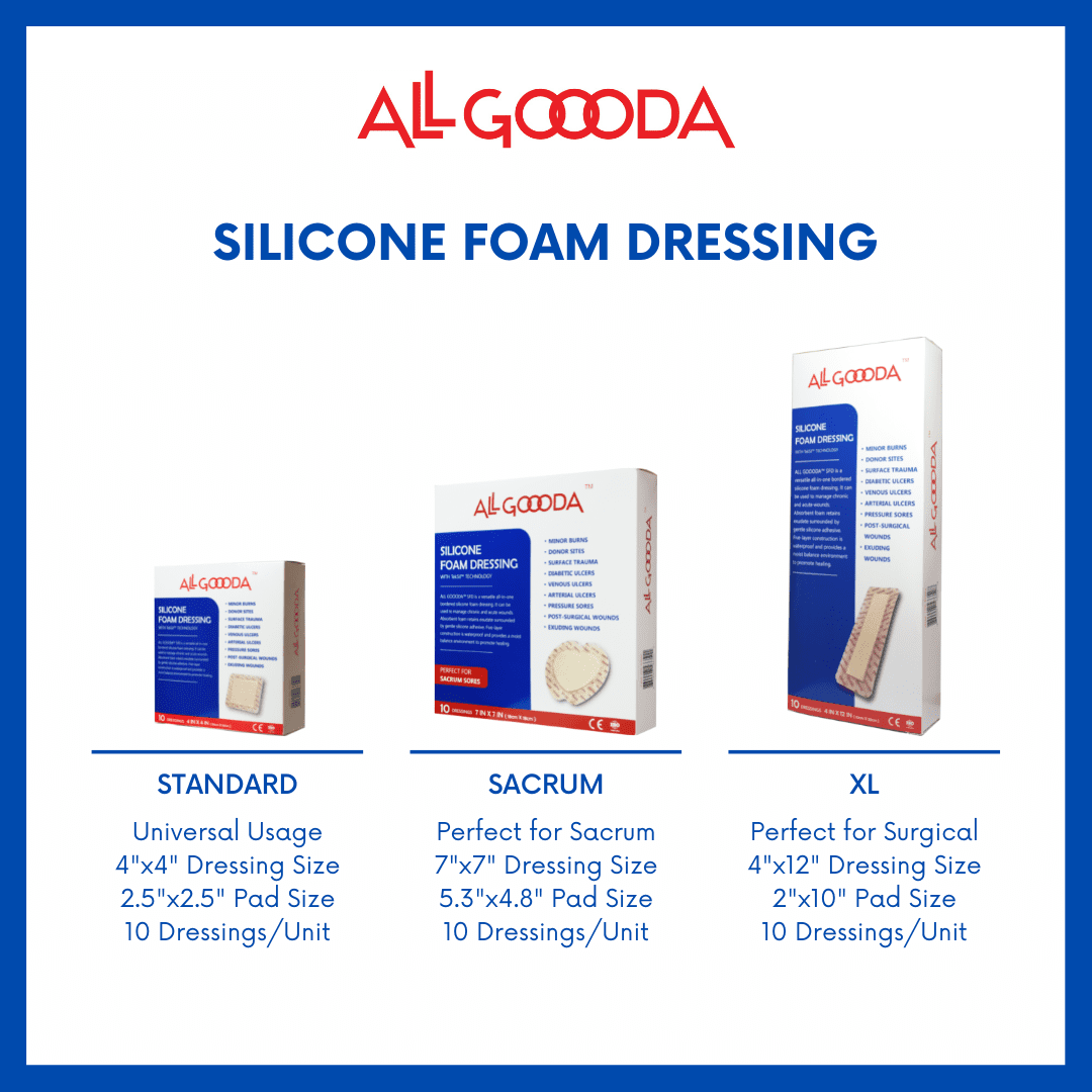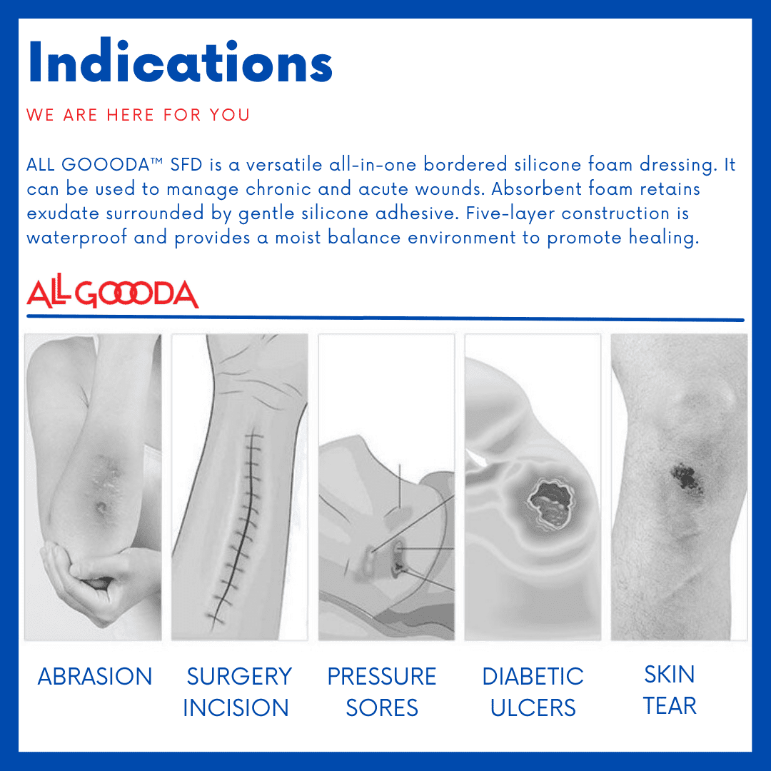 ALL GOOODA Silicone Foam Dressing is a versatile all-in-one gentle adhesive bordered silicone foam dressing. Five-layer construction is waterproof and provides a moist balance environment to promote optimal healing.