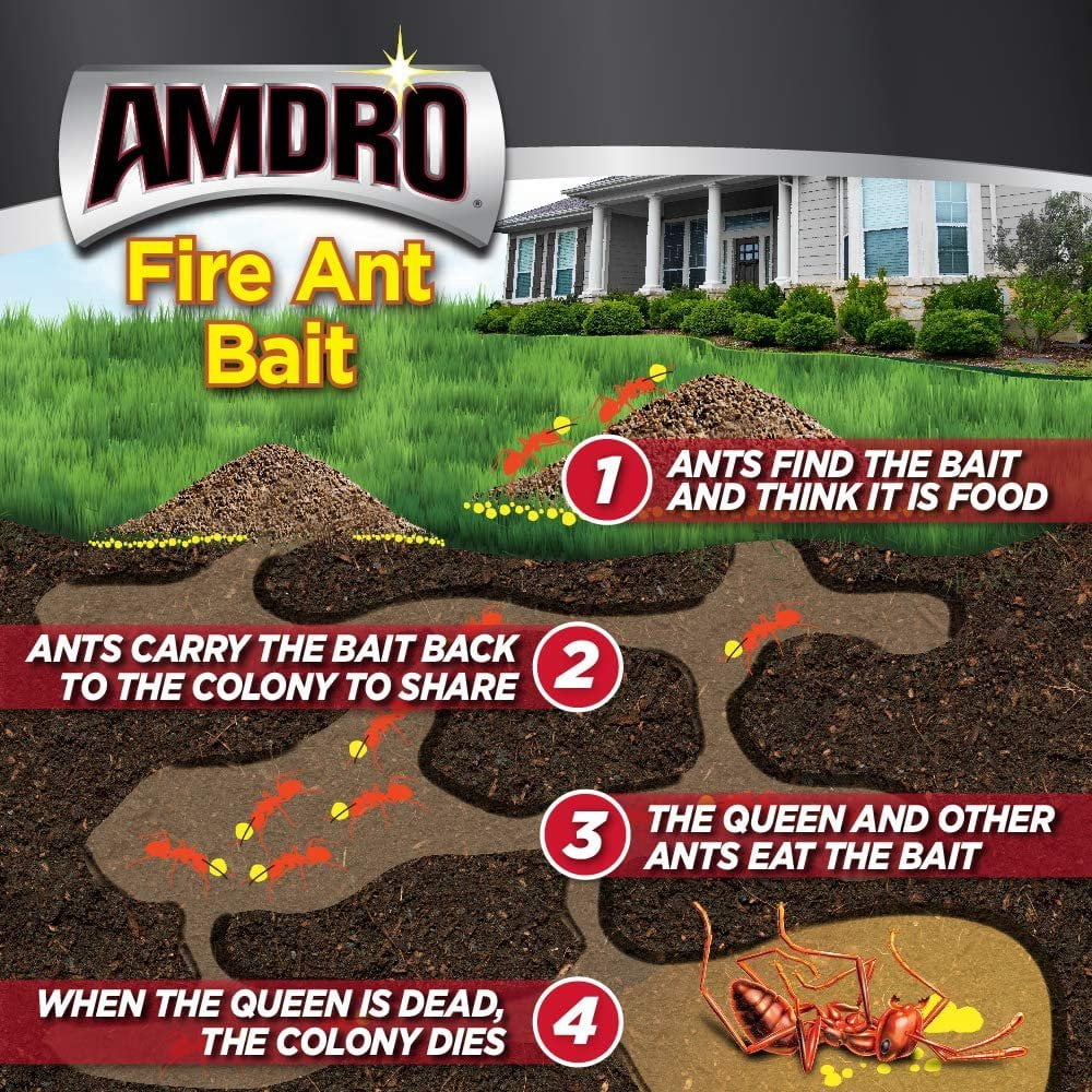 Amdro fire Ant bait is the original fire Ant Killer. It kills visible & hidden fire Ant mounds fast. Once you distribute a circle of bait around the mound, the worker fire ants carry it back to the colony to share it with the queen. After the queen eats it & dies, her colony dies with her. amdro fire Ant bait kills fire ants, bigheaded ants, & Harvester ants.