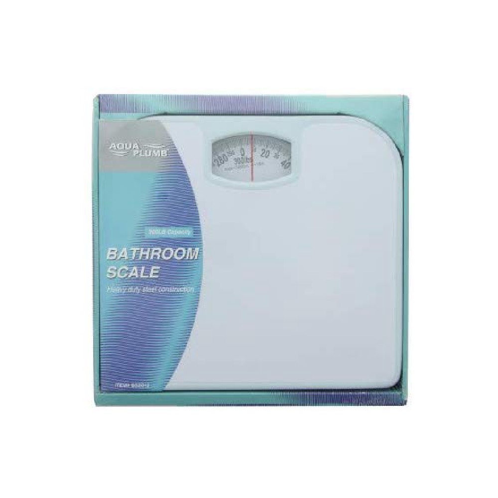 Aqua Plumb’s Bathroom Scale is made of heavy duty steel construction. Features a mechanical dial with a 300 LB capacity. White Color and measures about 10.5 x 11.06 x 1.75 Inches.