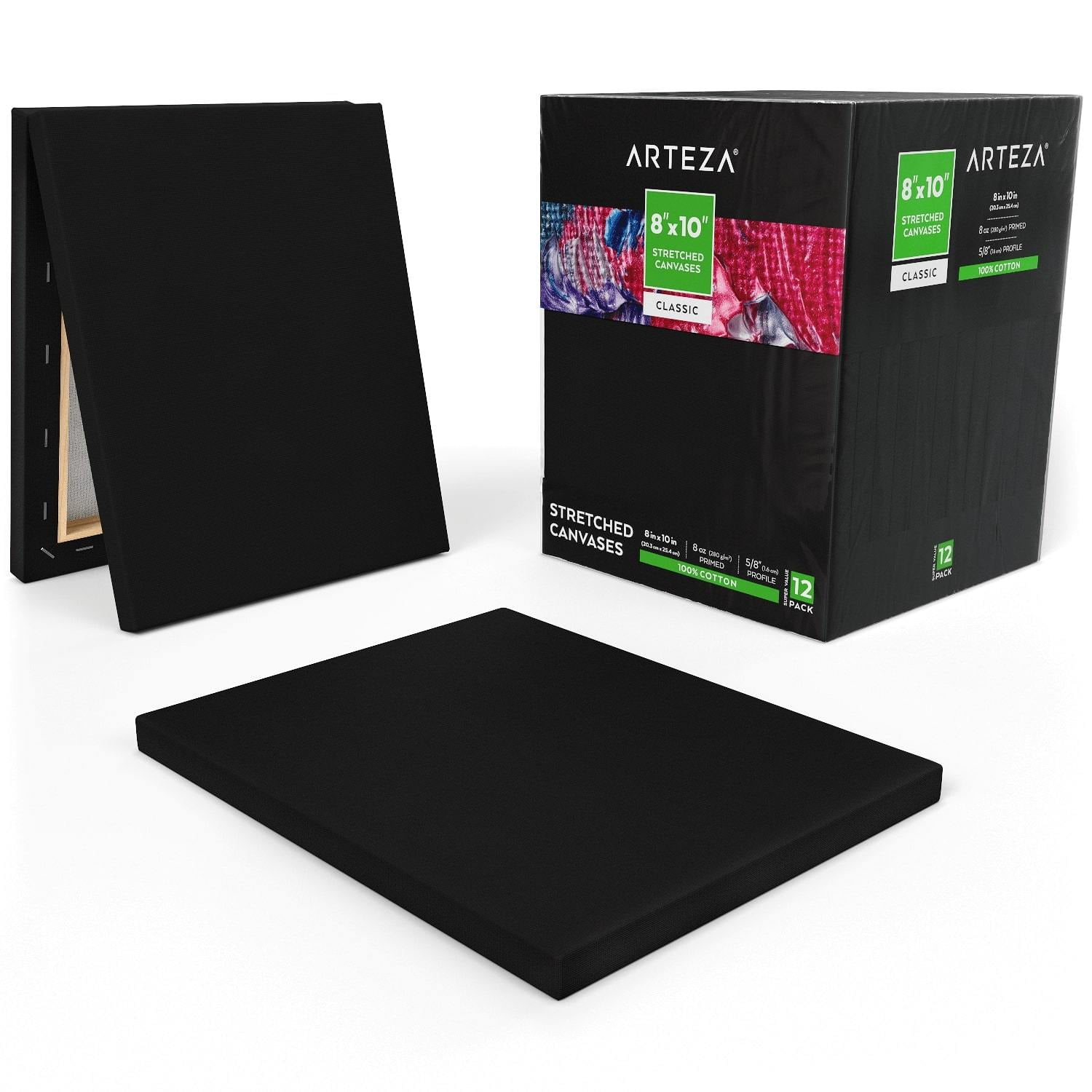 Arteza Stretched Canvas, Black, 8"x10", Blank Canvas Boards for Painting – 12 Pack (ARTZ-9274): Bulk Packaging – Save time and money by buying in bulk with this black stretched canvas 12-pack. Dramatic Effect – Pre-primed with black acrylic gesso that allows highlights to pop and shadows to appear deeper. Versatile Stretched Canvas – Sturdy 100% cotton surface, great for craft projects, oil and acrylic paintings, airbrushing, collages, and mixed media. Strong & Reliable – Back stapled on sturdy pine wood stretcher bars to hold your canvas firmly. Acid-Free – Protects your artwork from fading and yellowing over time. Arteza makes art supplies affordable to creators with every budget.