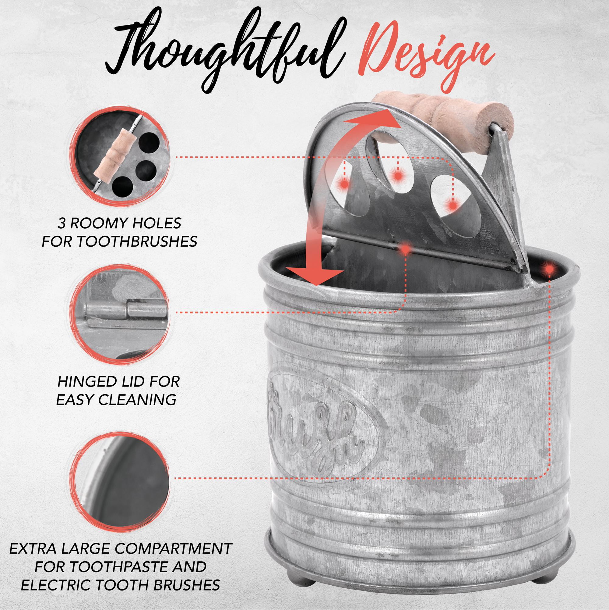 Give your toothbrushes and toothpaste the VIP home they deserve! Autumn Alley counter toothbrush holder’s durable, thick construction with mind-blowing galvanized finish evokes a fresh silver dash of functional style on any farmhouse bathroom sink setting. The unique hinged design makes a stylish, easy-to-clean, and sturdy toothbrush holder that doesn’t disappoint. Built to corral that countertop clutter, and look amazing- Wow! The ‘brush" label, wooden handle and ball feet pump up the cuteness level! At 3.5" in diameter, the mega rust-resistant perfectly-sized organizer holds 3 toothbrushes and the large rear compartment can handle an electric toothbrush or a tube of toothpaste with ease.