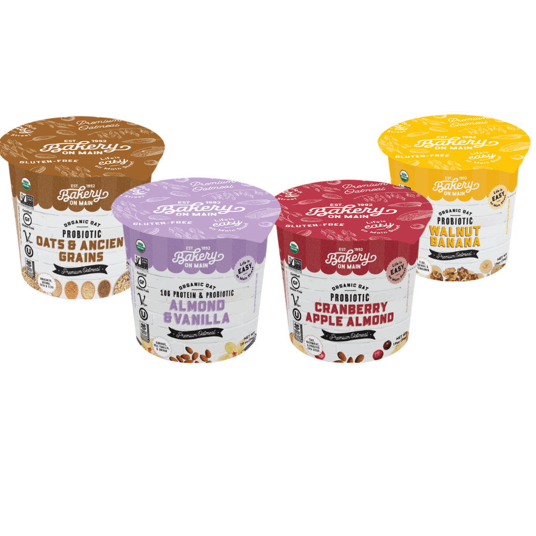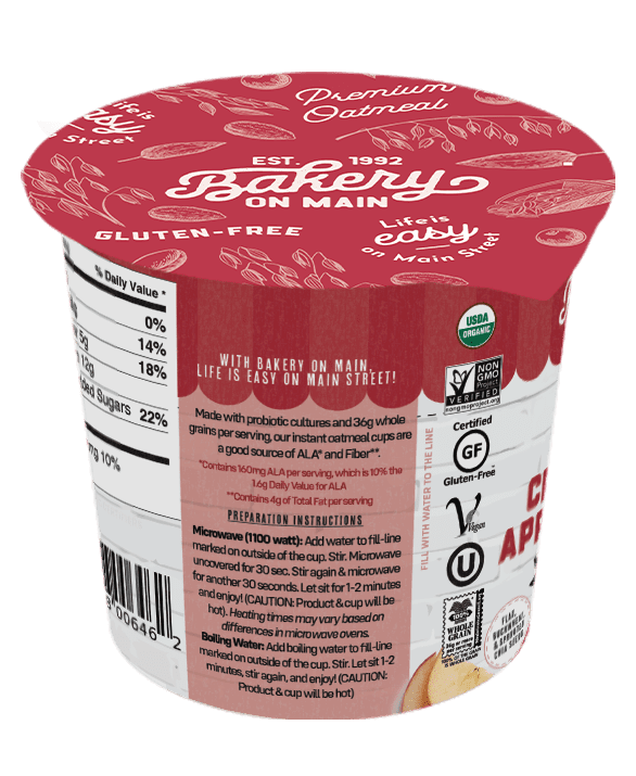 Bakery On Main’s cranberry apple almond oatmeal cup is made with probiotic cultures and 36g of whole grains per serving. In addition, this oatmeal is USDA organic certified and is a good source of ALA and fiber! About the Brand Founded in 1992, our story began as a bakery inside a small natural foods market on Main Street in Glastonbury Connecticut. Here we discovered our passion for creating delicious gluten-free and celiac-friendly breakfast and snack foods. We pride ourselves on our ability to craft granola, snack bars, and oatmeal that taste just as good (if not better) than our less healthy competitors. It’s our belief that everyone should be able to enjoy a satisfying meal that doesn’t sacrifice taste for wholesomeness. To indulge in a snack that’s filling and nutritious, a snack that fits perfectly within any individualized dietary wants and needs. Bakery On Main promises simple, effortless eating and snacking, on anybody’s terms.