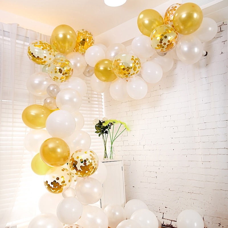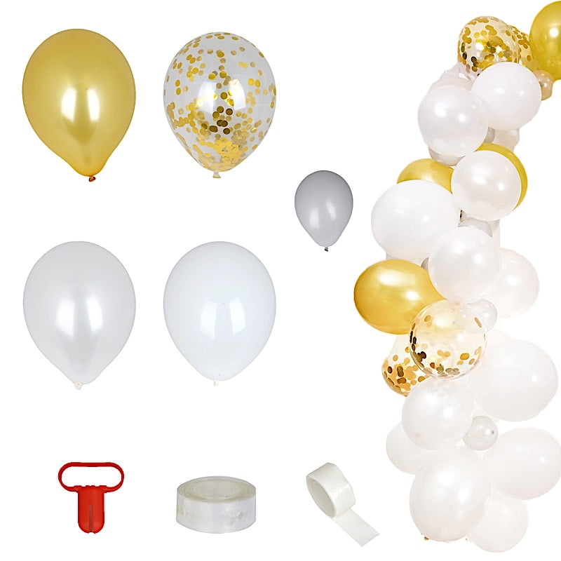 30 metallic white, 30 white and 10 clear with gold confetti balloons in medium balloons packs.