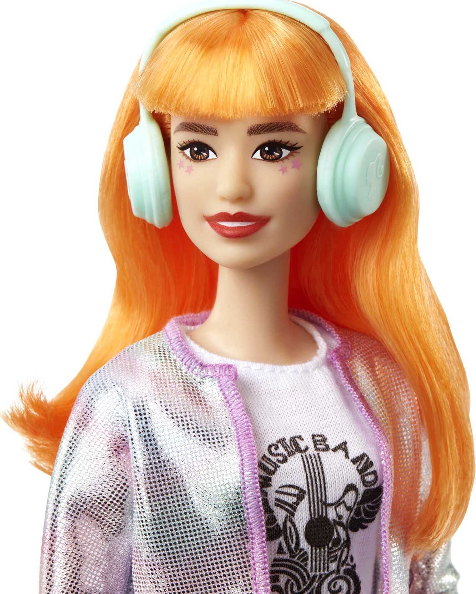 - Music producer Barbie doll (approx.12-in/30.40-cm) is dressed in a trendy graphic tee, jeans, an iridescent crop jacket and platform boots and comes with colorful mid-length orange hair!