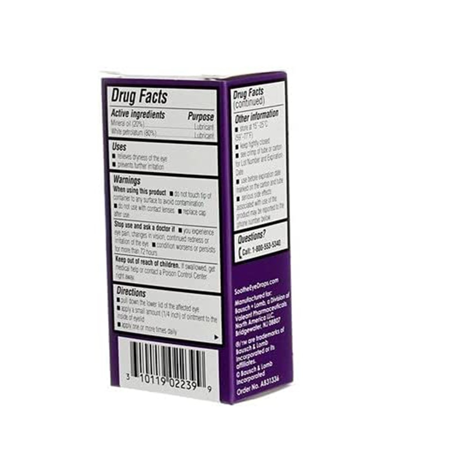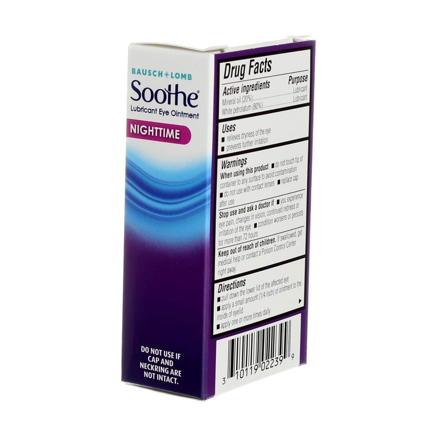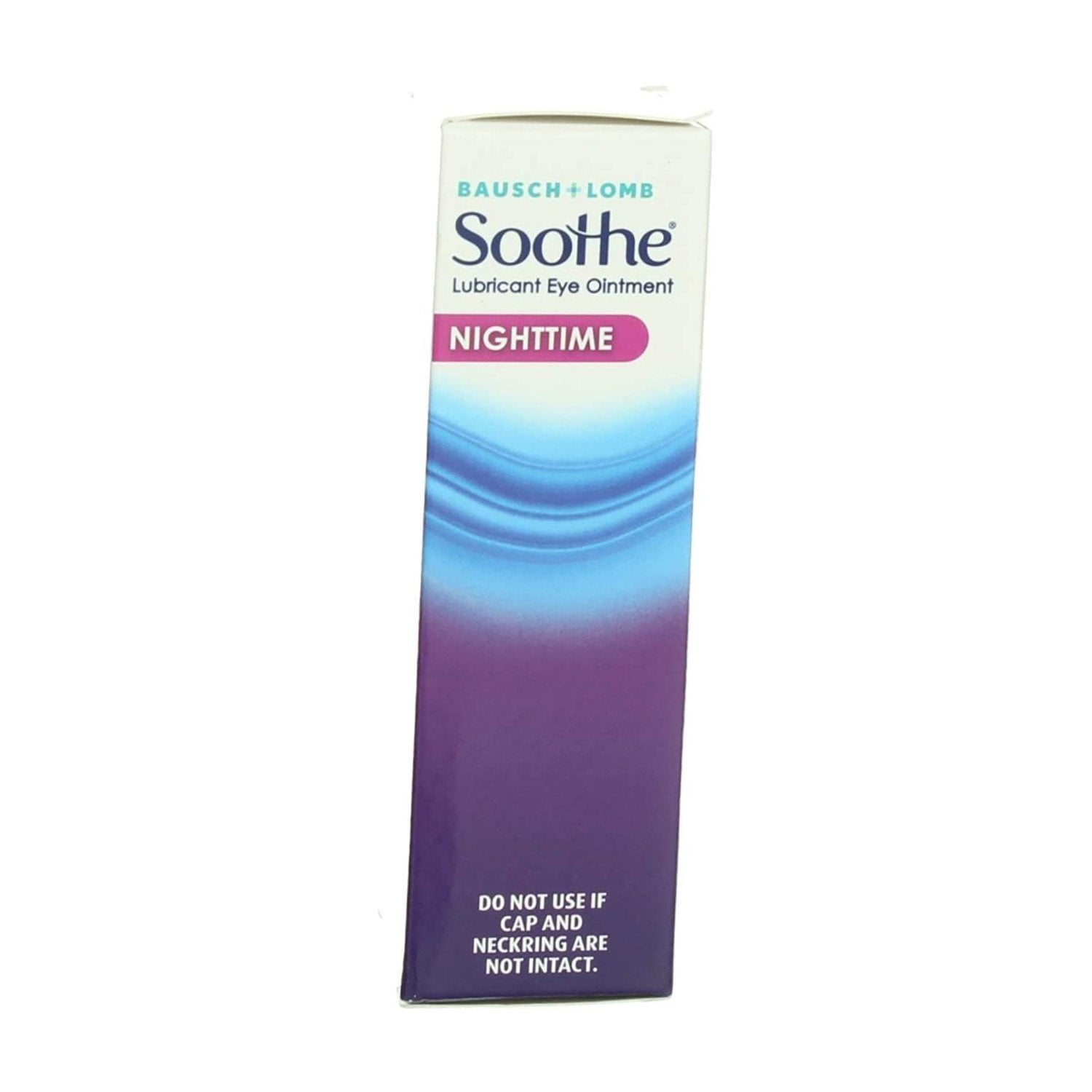 Bausch + Lomb Soothe Night Time Lubricant Eye Ointment provides overnight relief of dry eye. The formula contains two lubricants to relieve dryness of the eye and help prevent further irritation, And it is gentle enough to use as often as needed.DRY EYE OINTMENT: Soothe Lubricant.