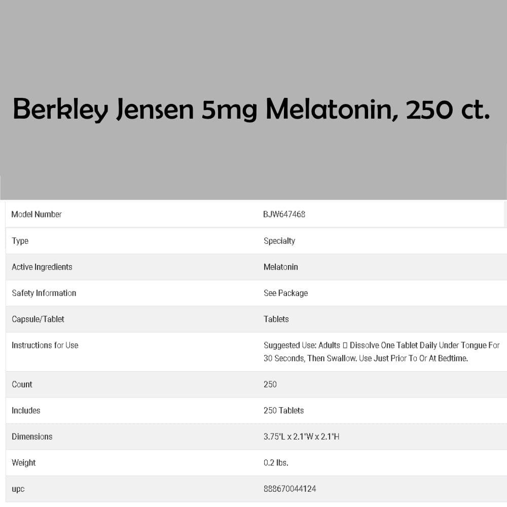 Melatonin is a naturally occurring compound that is produced by the body. It has been associated with normal body rhythms and sleep/wake patterns. Product Features: Helps promote healthy, normal sleep/wake rhythms and patterns Natural cherry flavor Gluten-free Includes 250 tabletsBerkley Jensen 5mg Melatonin, 250 tablets