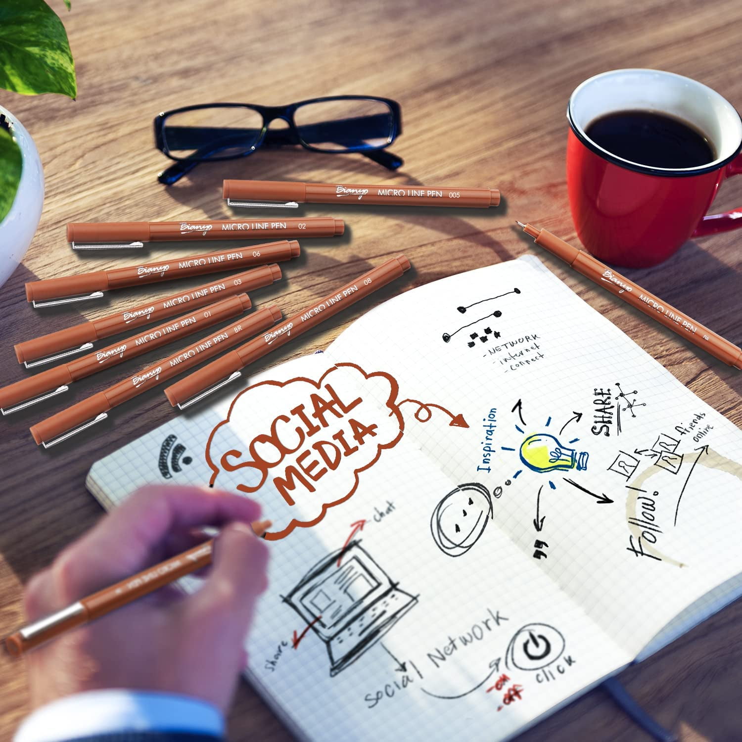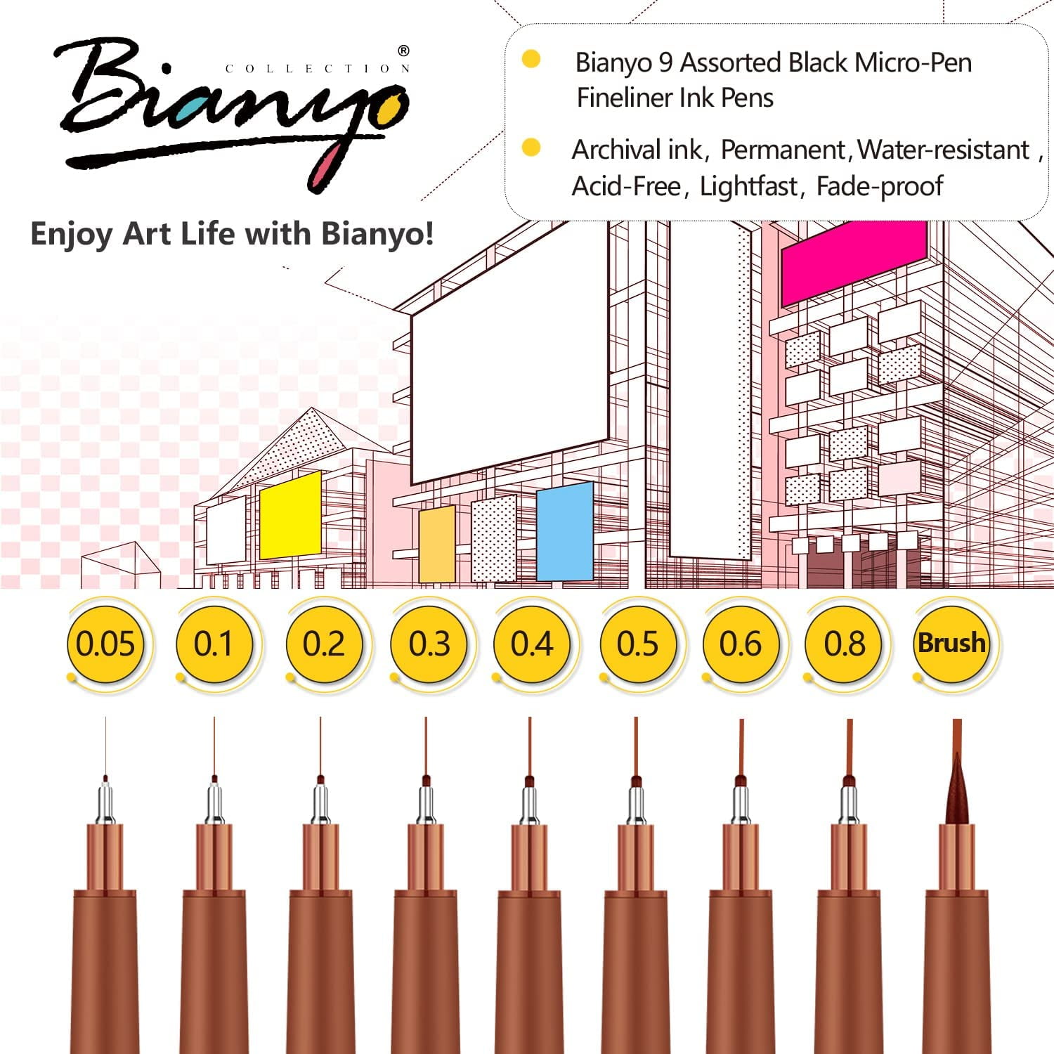 Bianyo Sepia Micro-line Pens Fineliner Ink Pens,Set of 9