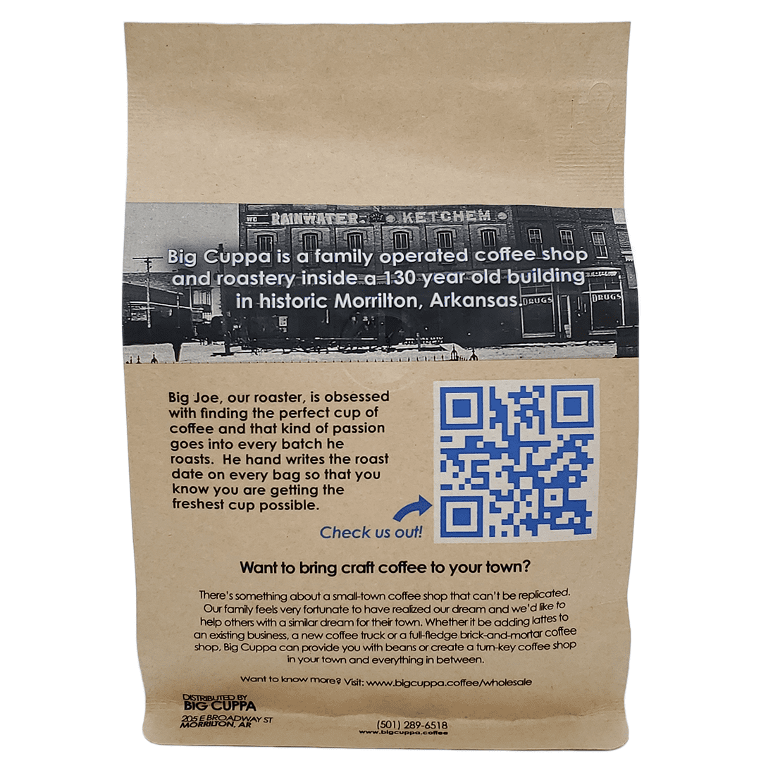 Big Cuppa Haffeinated Half Caff Whole Bean Coffee – Just because you would like a little less caffeine in your life doesn’t mean you can’t have craft coffee! The decaf portion of this Colombia and Brazil blend uses Swiss Water processing, which is important because it means harsh chemicals weren’t used to decaffeinate the bean. You get all the flavor of fully caffeinated coffee with only half of the caffeine! Origin: Colombia & Brazil Processing: Natural & Swiss Water Tasting Notes: Dark Chocolate, Brown Sugar, Walnut