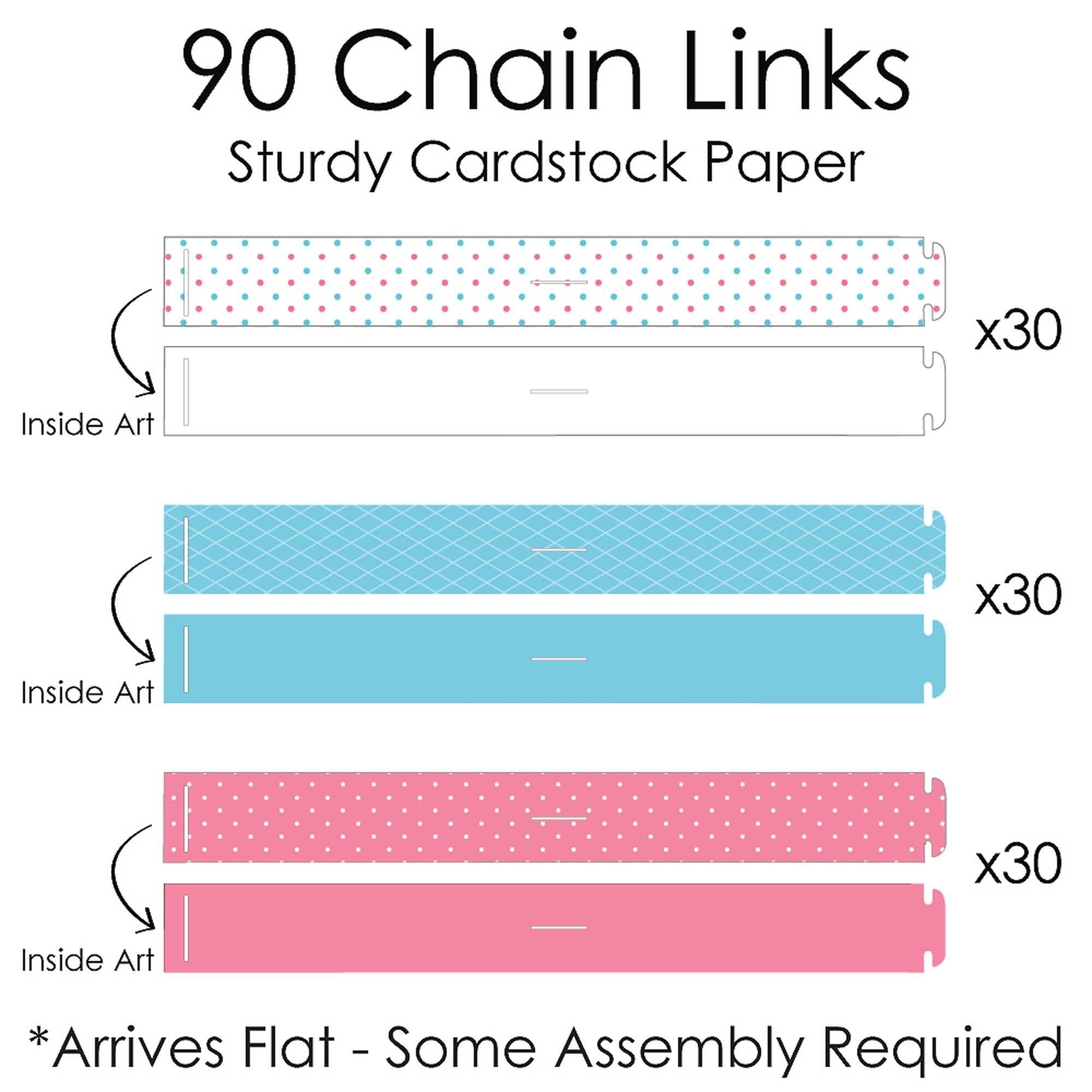 - DIY PARTY SUPPLIES: Dress up all areas of your gender reveal party with paper chains. Some fun decorating ideas are to wrap paper chains down a staircase railing, hang above doorways, or use as a photo booth backdrop. For an effortless look, stretch paper chains garland down the center of your dining room table. Paper chains can also be used to count down the days to a big event or trip.