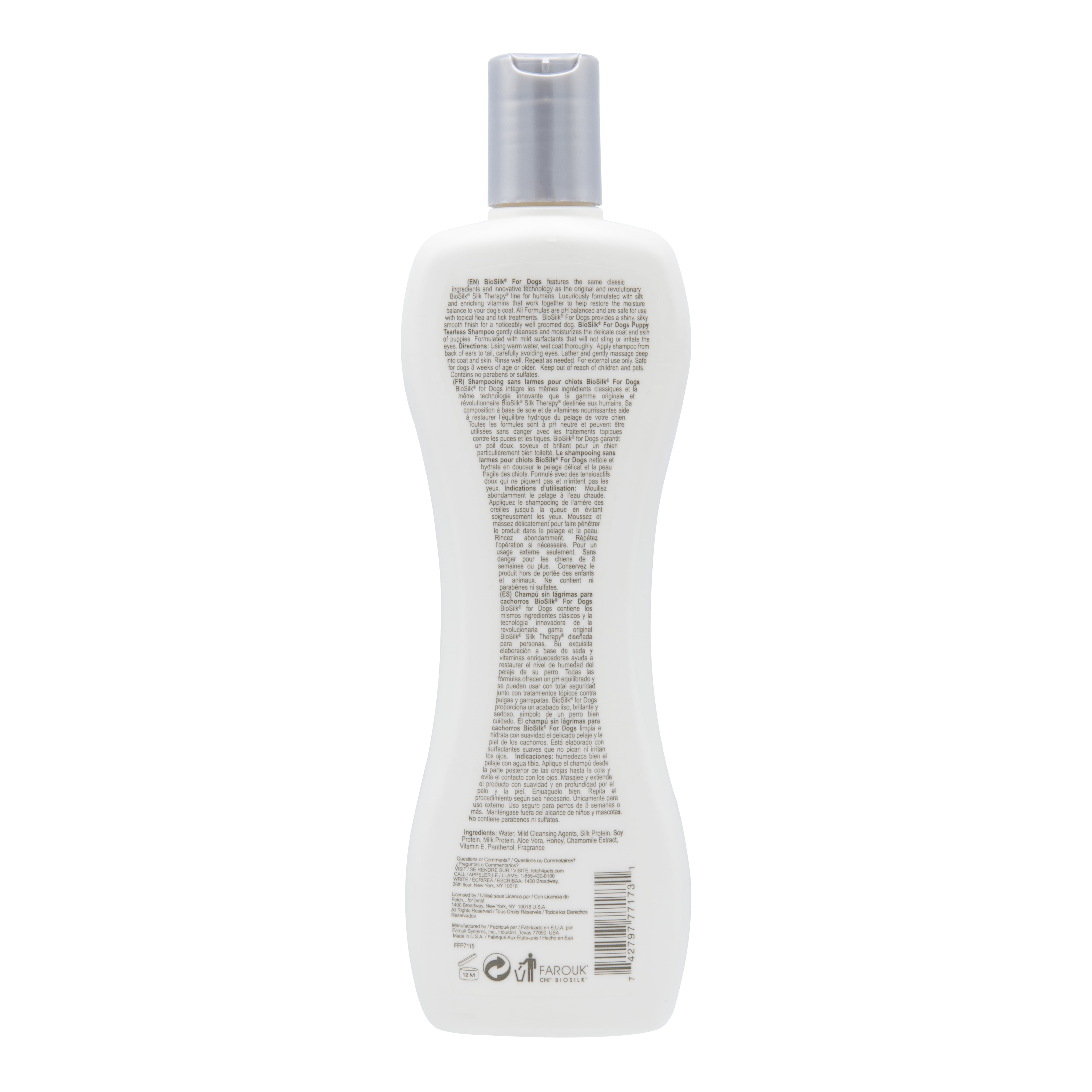 BioSilk Therapy Tearless Puppy Shampoo features the same classic ingredients and innovative technology as the original and revolutionary BioSilk Silk Therapy line for humans. Luxuriously formulated with silk and enriching vitamins that work together to restore the moisture balance to your puppy’s coat. Our Tearless Puppy Shampoo is specially made for a puppy’s delicate skin and coat and works to clean and moisturize without being harsh or drying to sensitive puppy skin. All BioSilk Dog products are pH balanced for puppies making it the perfect bath time solution for your fur baby. Get your BioSilk Therapy for Dogs Puppy Tearless Shampoo and your puppy will be soft, shiny, and clean.