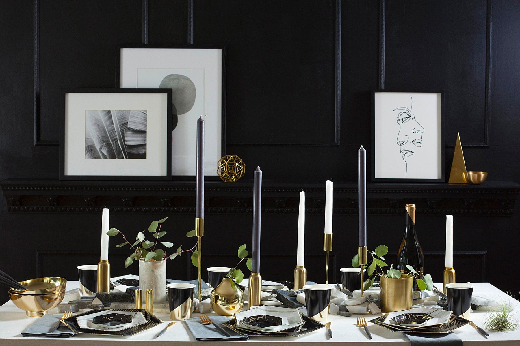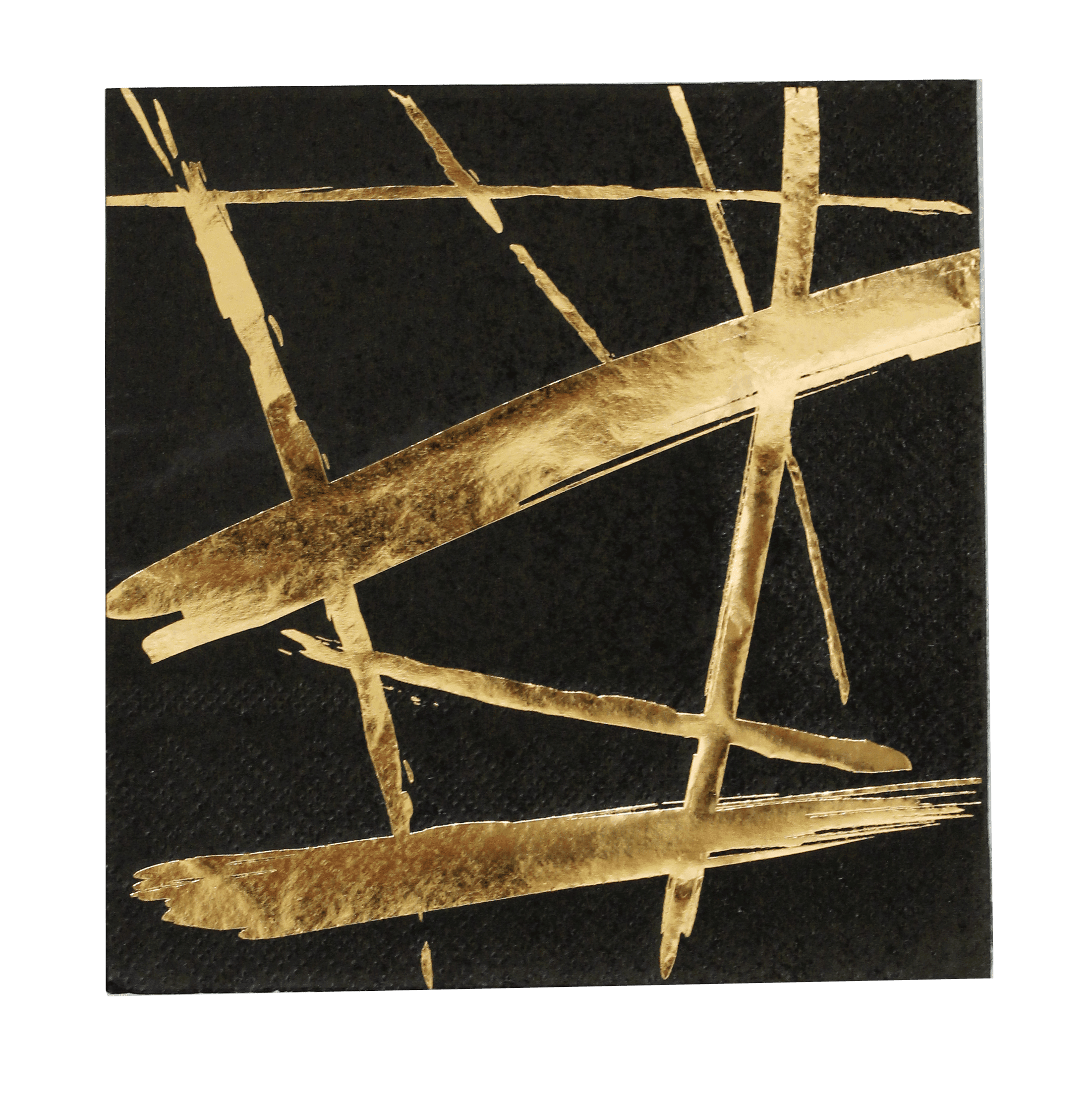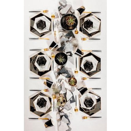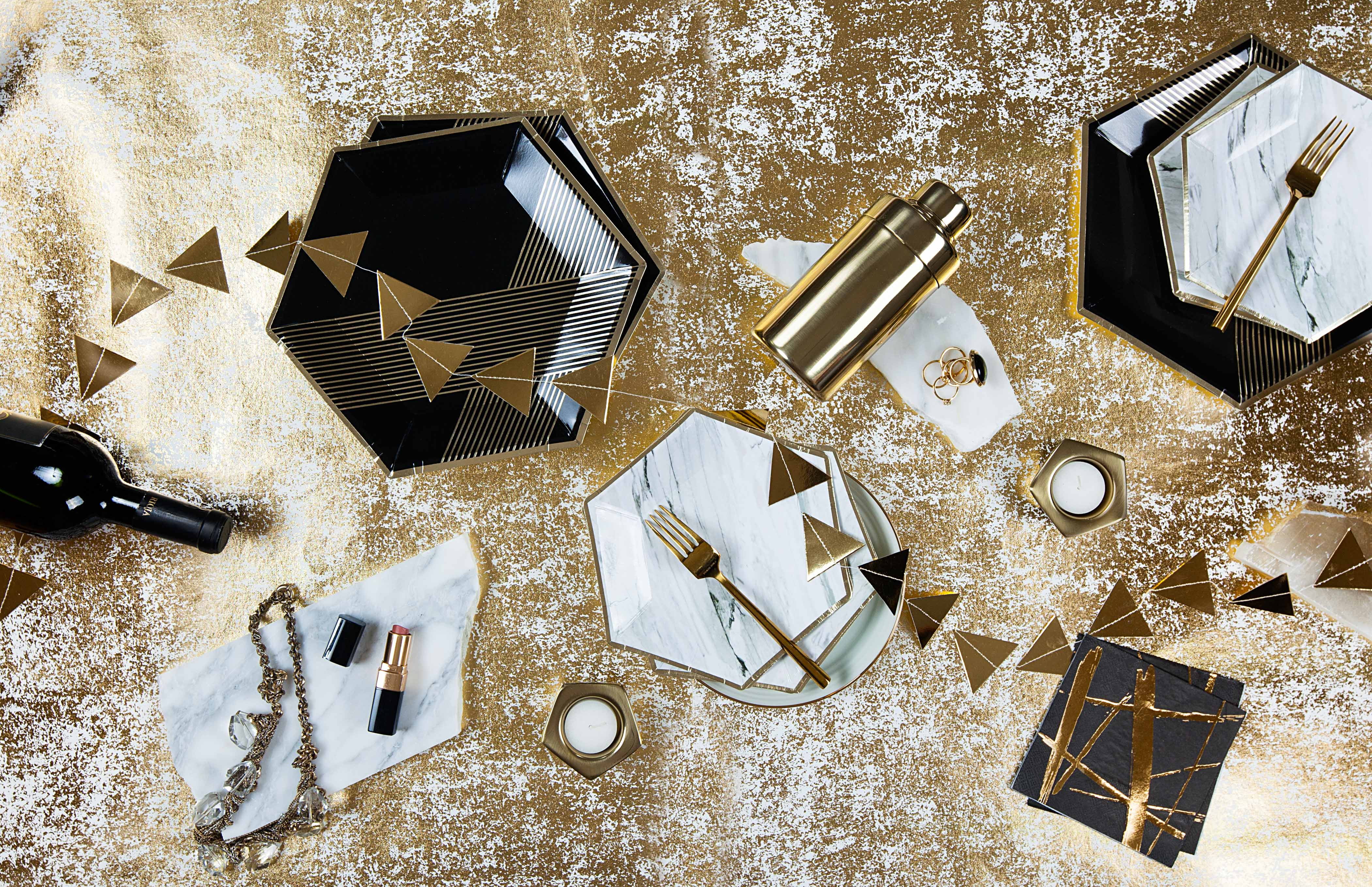 Sophisticated glam, understated glitz. Our Noir Collection exudes a feeling of luxe with its Deco-inspired patterns and colors. The kit serves 16 guests and contains an assortment of chic party essentials including large and small plates, cocktail napkins, and a gold triangles garland to hang above a dessert table or bar cart. Our Noir Essentials Party Kit will allow you to entertain effortlessly for holidays and other special affairs.Set includes 16 large paper plates (approximately 10.5" wide); Set includes 16 small paper plates (approximately 8" wide); Set includes 20 paper cocktail napkins (approximately 5" wide folded); Set includes 1 gold paper garland (approximately 2" wide triangles; 10ft long garland); Products are not microwavable; Products are made of paper.