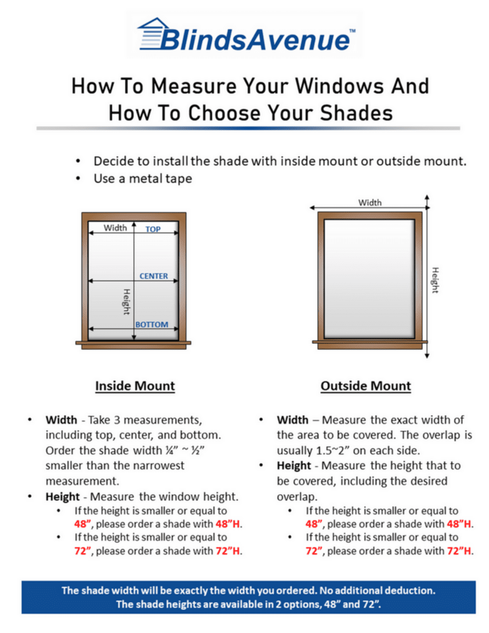 - BlindsAvenue for inside mount shades order the width 1/4 to 1/2" smaller than the window opening. For outside mount shades order the shade the exact width you would like the shade to be.