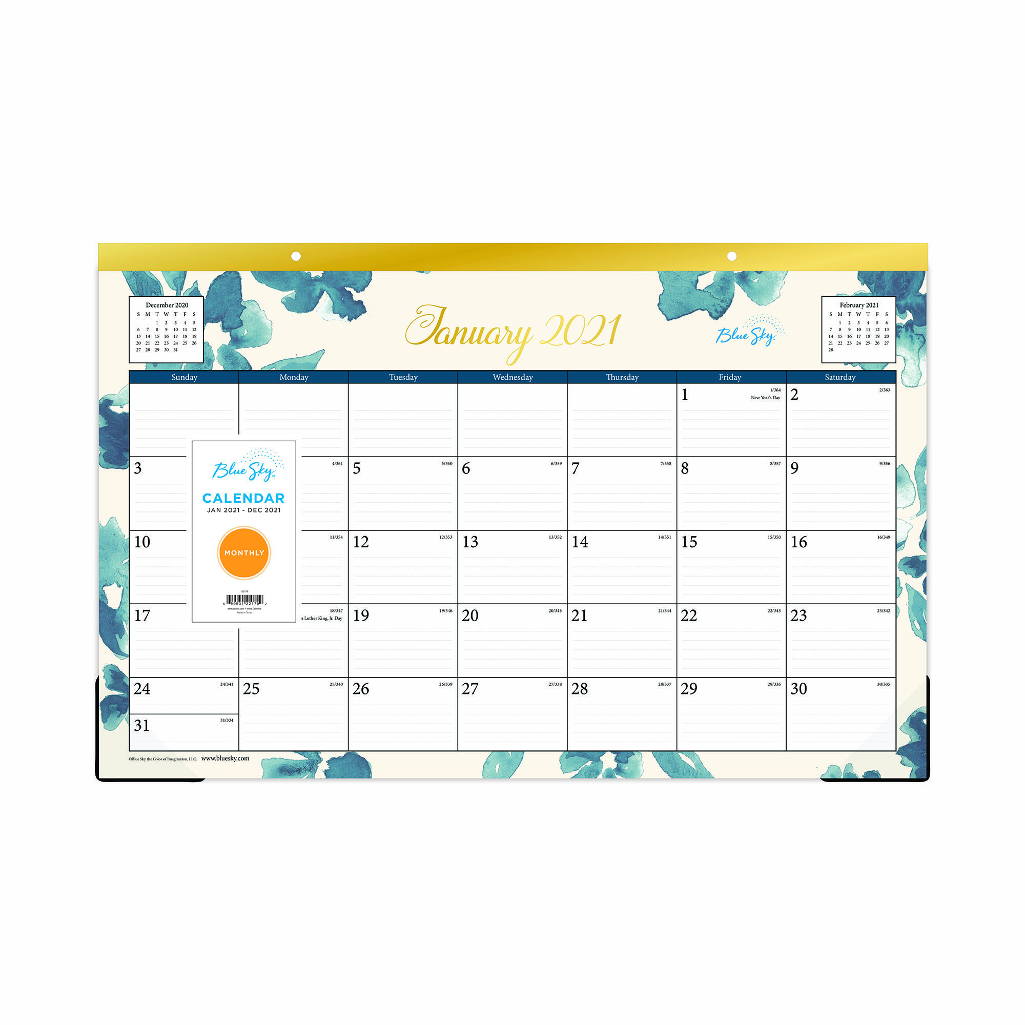 "Make the most out of your workspace by using a Blue Sky 2021 desk pad calendar, complete with lined blocks on high quality white paper for optimal scheduling. This unique office addition protects the surface of your desk while enhancing the beauty of it. Keep track of birthdays, appointments and other important dates on this monthly flat desk calendar, dated January 2021 – December 2021. Place this calendar under your computer or keyboard, and use it as a writing surface for extra convenience. Each page displays a distinctive frame print around the calendar blocks. Perforated pages ensure easy tear-off and plastic corner covers secure each month’s page. Perfect for home, school or office, this essential 2021 Blue Sky desk pad calendar is a versatile office supply that offers a fresh start every month. Plan to do more of what you love®."