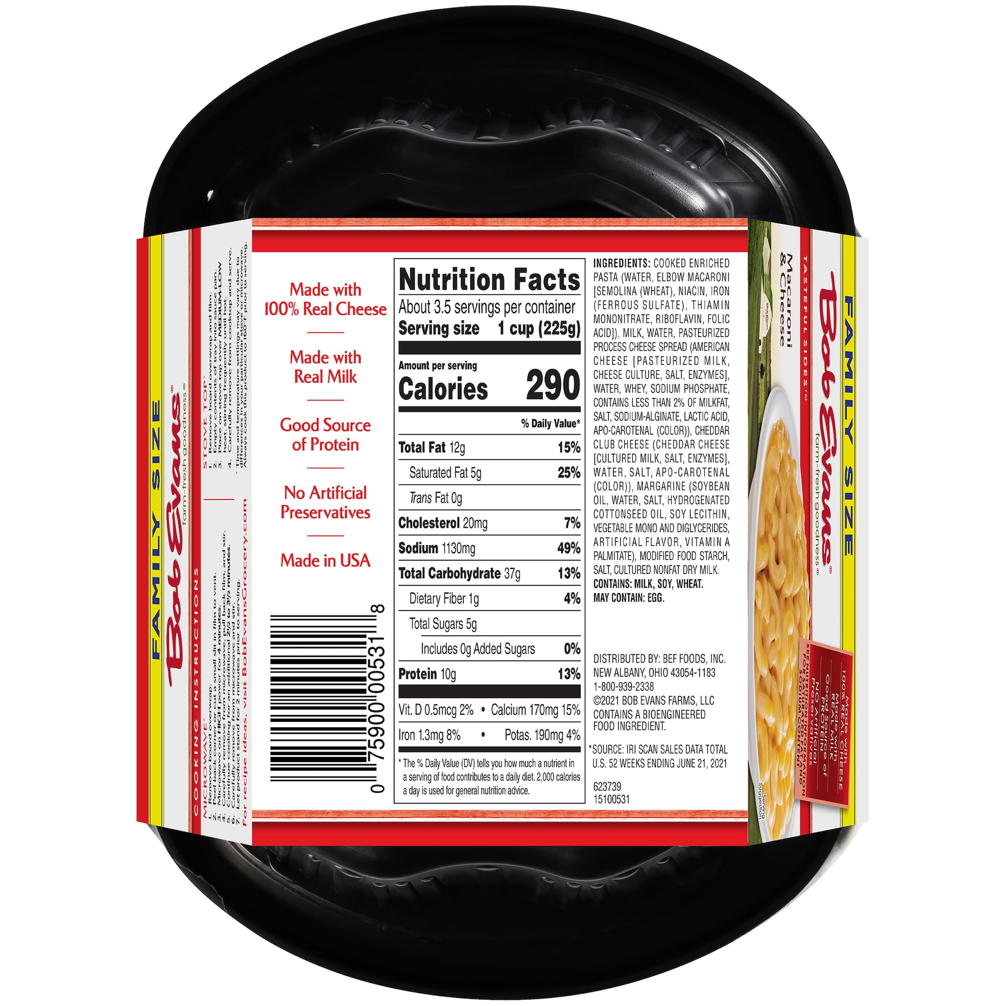 The ultimate comfort food, Bob Evans Macaroni and Cheese makes a convenient and savory side dish. Great for adults as well as kids, Bob Evans (BEF Foods, Inc.) Macaroni and Cheese is easily prepared in the microwave – just heat it and eat! The 28 Oz pack serves 3-4 people and contains no artificial preservatives or artificial colors. A wholesome meal with homemade taste, Bob Evans Macaroni & Cheese is a good source of calcium and made with real cheddar cheese.