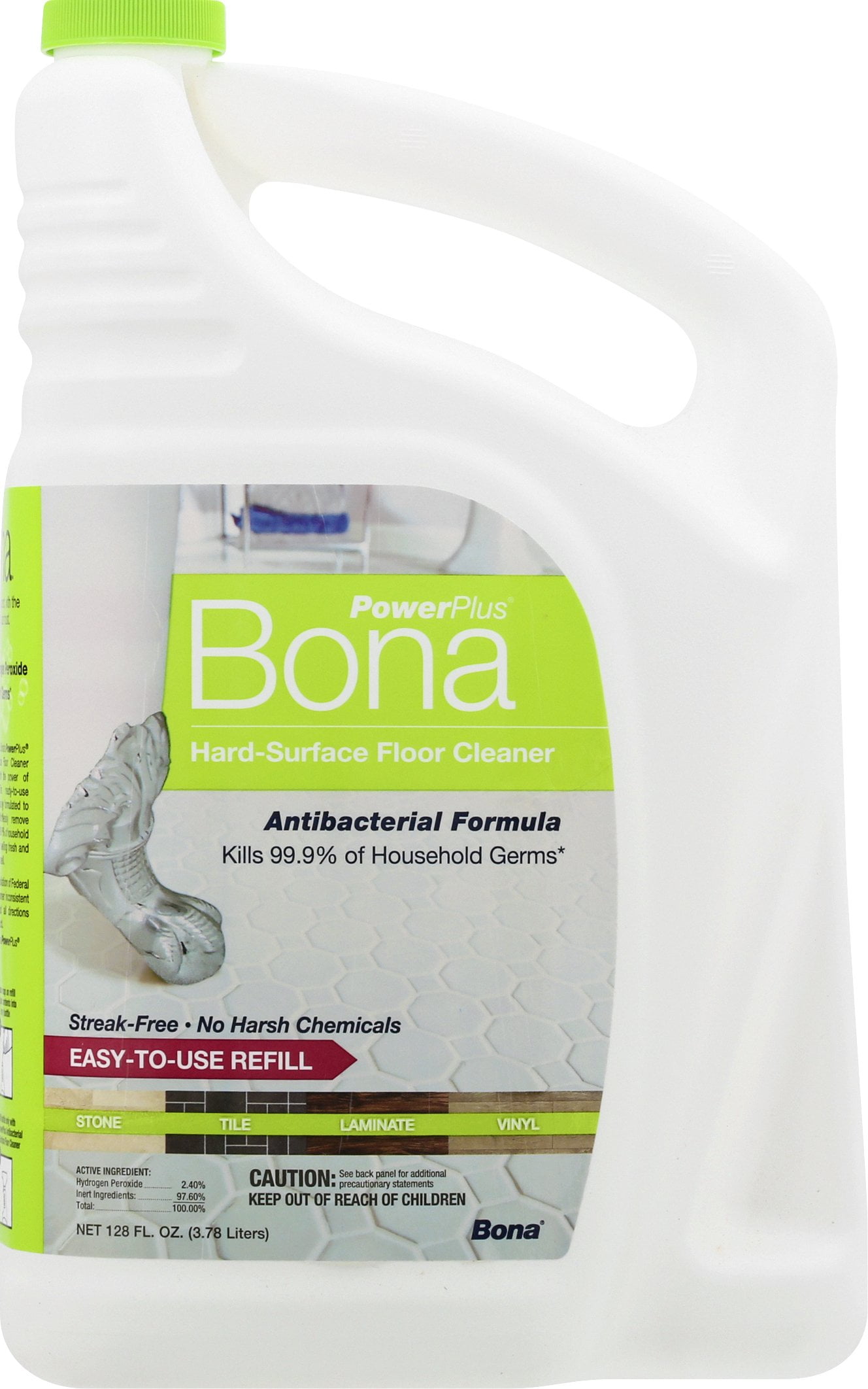 - Antibacterial formula. Kills 99.9% of household germs (Kills 99.9% of Influenza a H1N1 virus, rhinovirus, Escherichia coli, Listeria monocytogenes, Pseudomonas aeruginosa, Salmonella enterica, Staphylococcus aureus, Methicillin-resistant staphylococcus aureus (MRSA), and Trichophyton mentagrophytes on hard, non-porous surfaces in 10 minutes). Steak-free. No harsh chemicals. Easy-to-use refill. Stone. Tile. Laminate. Vinyl.Bona PowerPlus Antibacterial Hard-Surface Floor Cleaner is for use on unwaxed, polyurethane finished wood, ceramic tile with sealed grout lines, sealed granite, or laminate flooring. Use of this product on unsealed surfaces may cause staining. Do not use on unfinished, oiled, or waxed wood floors, non-sealed tiles, carpet floor, or marble. It is not recommended to follow the disinfect directions for an entire wood or laminate floor due to excess moisture being introduced, which could cause damage. Treating spots, spills or small areas will minimize the risk of water damage. Regular cleaning with the Bona PowerPlus family of floor cleaners is safe for all urethane finished hardwood and sealed hard-surface floors. Performance you expect, with the ingredients you can trust. Powered by hydrogen peroxide kills 99.9% of germs (Kills 99.9% of Influenza a H1N1 virus, rhinovirus, Escherichia coli, Listeria monocytogenes, Pseudomonas aeruginosa, Salmonella enterica, Staphylococcus aureus, Methicillin-resistant staphylococcus aureus (MRSA), and Trichophyton mentagrophytes on hard, non-porous surfaces in 10 minutes). Clean without compromise. Bona’s PowerPlus Antibacterial Hard-Surface Floor Cleaner cleans and disinfects with the power of hydrogen peroxide. This ready-to-use antibacterial cleaner is uniquely formulated to powerfully clean and effortlessly remove stubborn stains while killing 99.9% of household germs (Kills 99.9% of Influenza a H1N1 virus, rhinovirus, Escherichia coli, Listeria monocytogenes, Pseudomonas aeruginosa, Salmonella enterica, Staphylococcus aureus, Methicillin-resistant staphylococcus aureus (MRSA), and Trichophyton mentagrophytes on hard, non-porous surfaces in 10 minutes). It leaves your home smelling fresh and clean with no harsh chemical smell. A Bona System cleaner. www.Bona.com. For ingredients & other information, visit www.Bona.com. (877) BuyBona (877-289-2662).