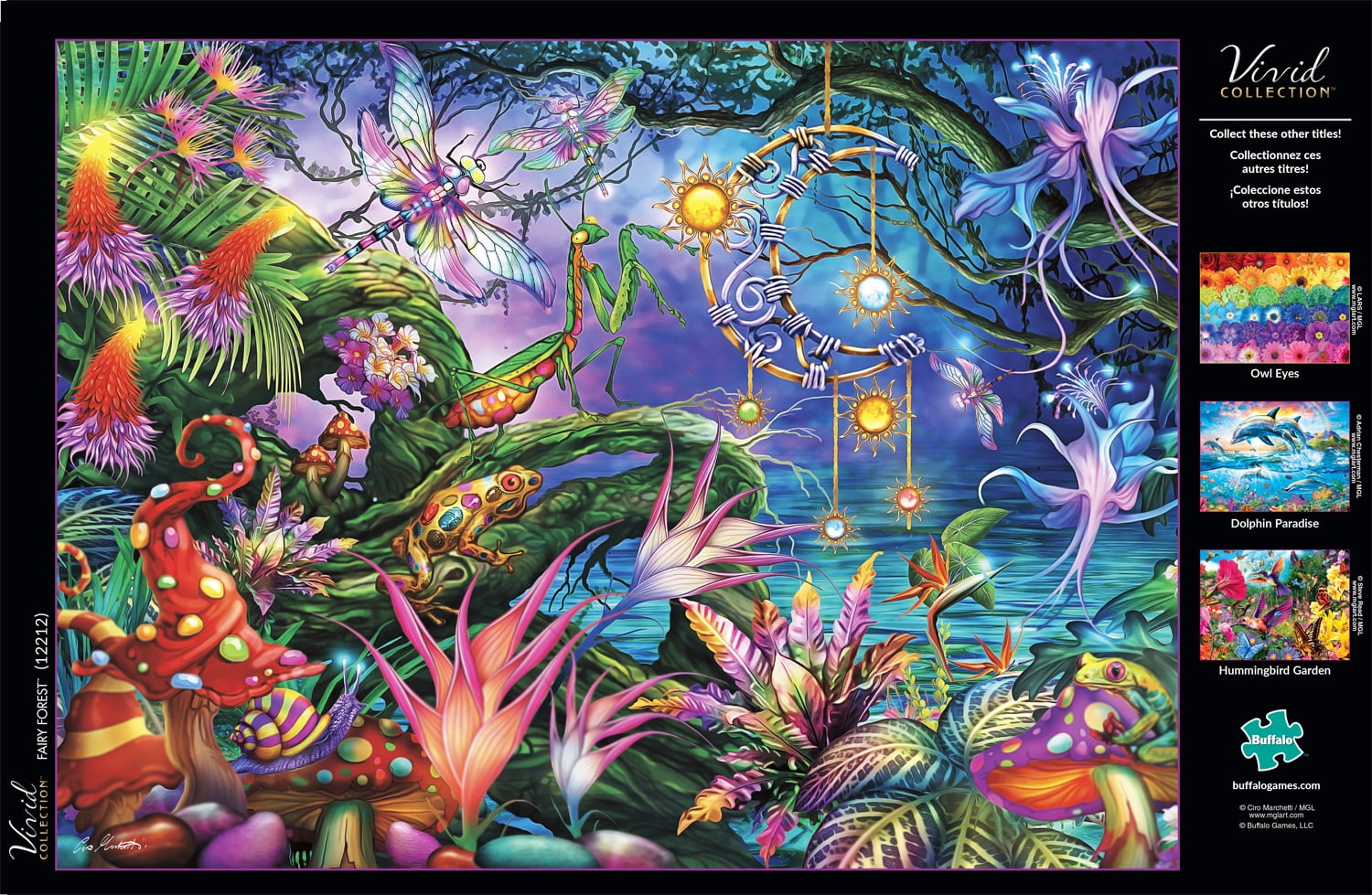Incredible colors and mystical creatures fill this puzzle. Fairy Forest is part of Buffalo Games Vivid Collection of jigsaw puzzles. The Vivid Collection includes a variety of bright images from an array of artists and photographers from around the globe. Every Buffalo Games jigsaw puzzle is manufactured from recycled puzzle board. A precision cutting technique guarantees that every piece will fit soundly with the company’s signature Perfect Snap.
