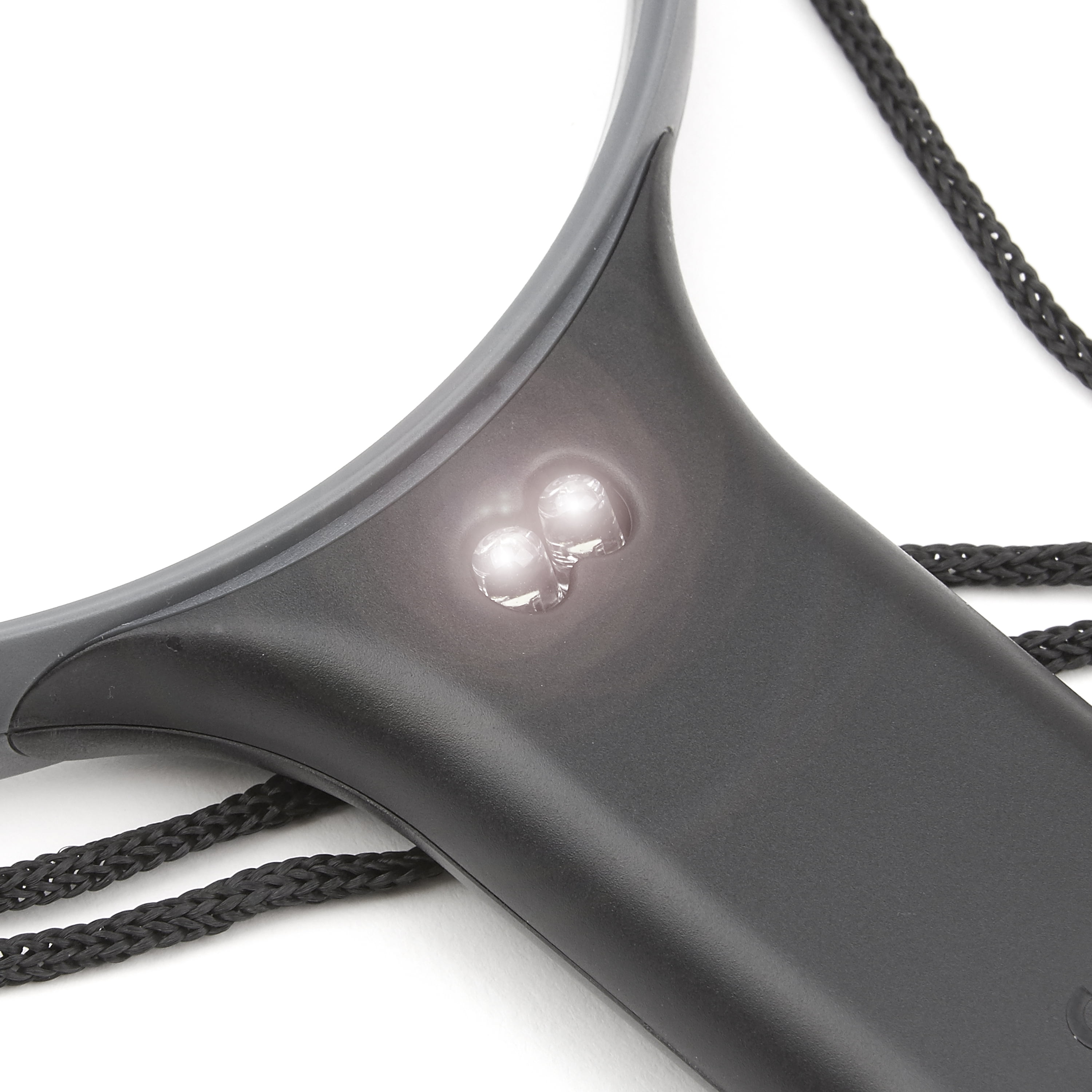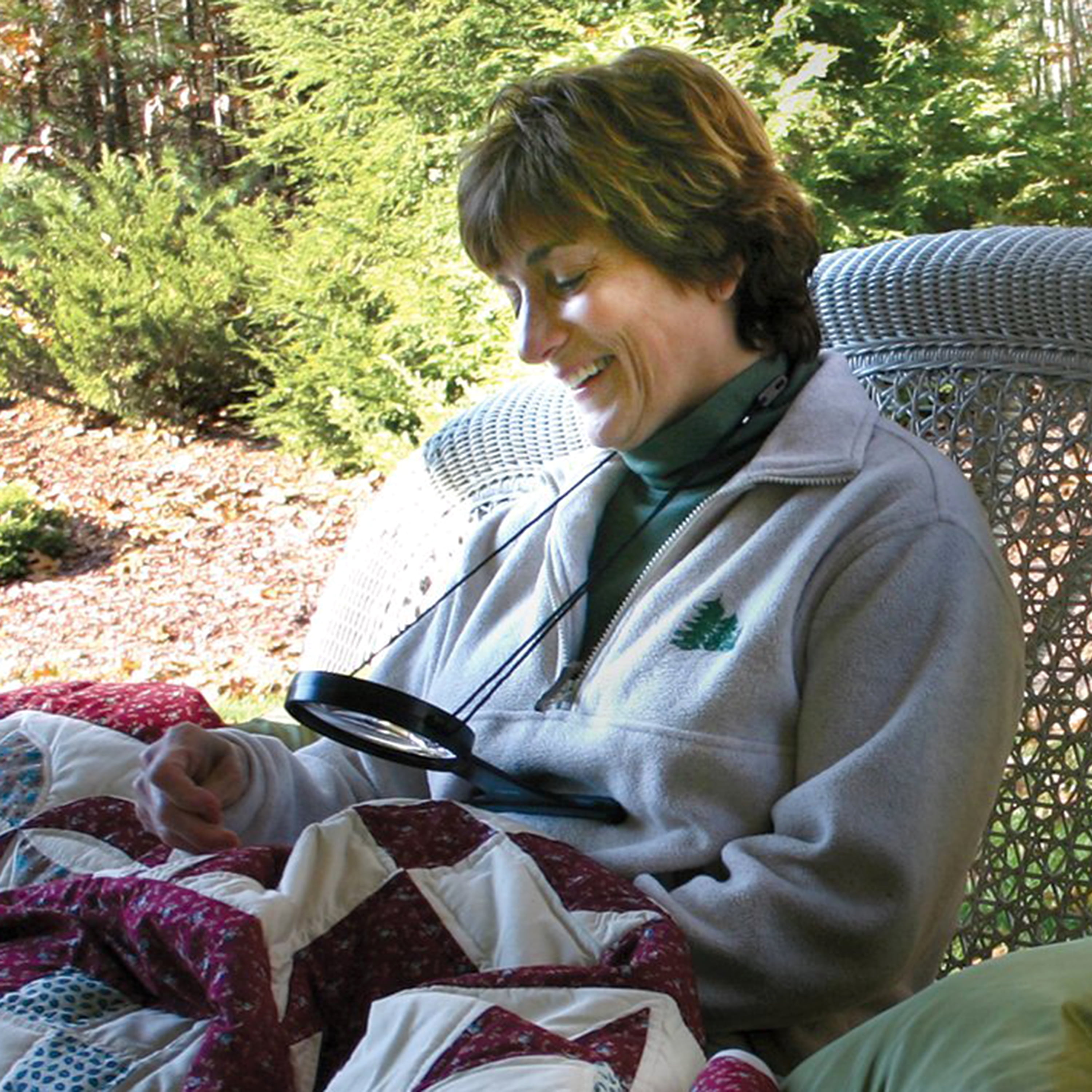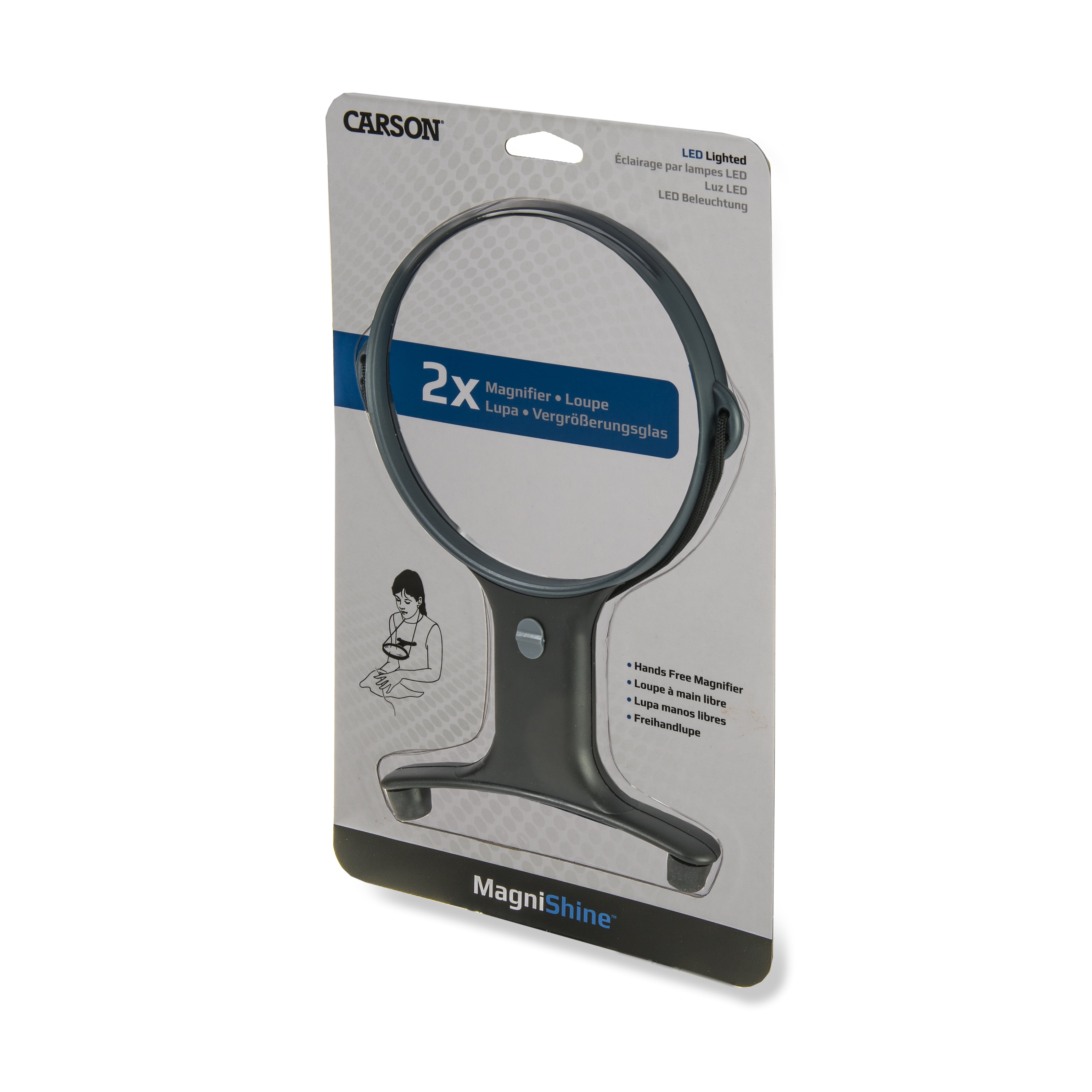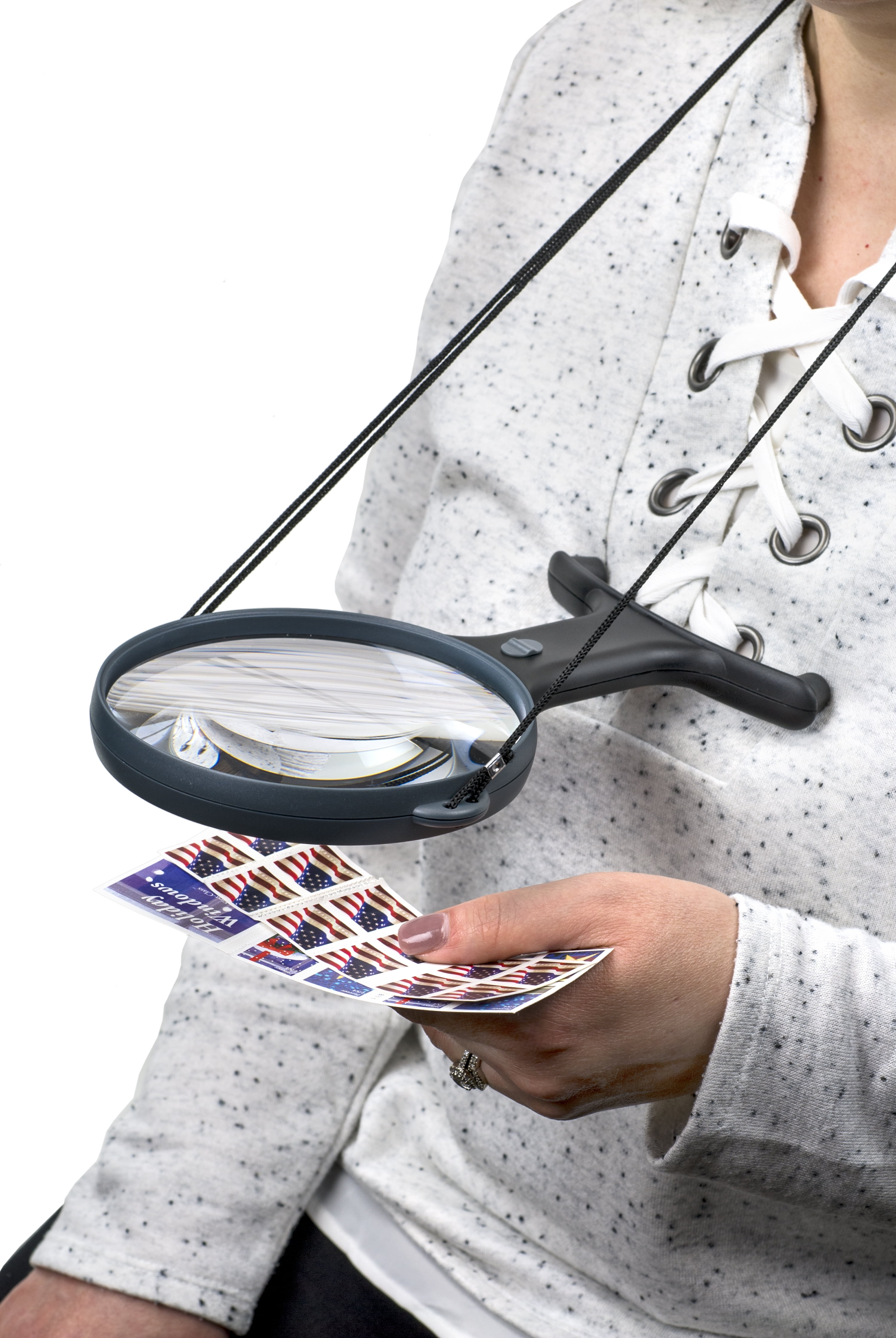 The Carson HF-66, MagniShine™ LED Lighted 2x Power Hands-Free Magnifier is a popular magnifying glass among crafters. The wide 5” acrylic lens allows for greater viewing flexibility without adding undue stress to your neck. It’s equipped with a bright light dual-LED, making viewing easy in any light condition. The wide bridge and adjustable neck strap are designed to be used at various angles to accommodate a wide range of visual needs and comfort. Simply hang it around your neck, adjust the bridge and strap to a comfortable viewing distance and enjoy hours of hands free crafting. This magnifier is perfect for crafting, needlepoint, crochet, and cross-stitch. Bring the MagniShine with you anywhere! Uses 3-AAA Batteries (not included).