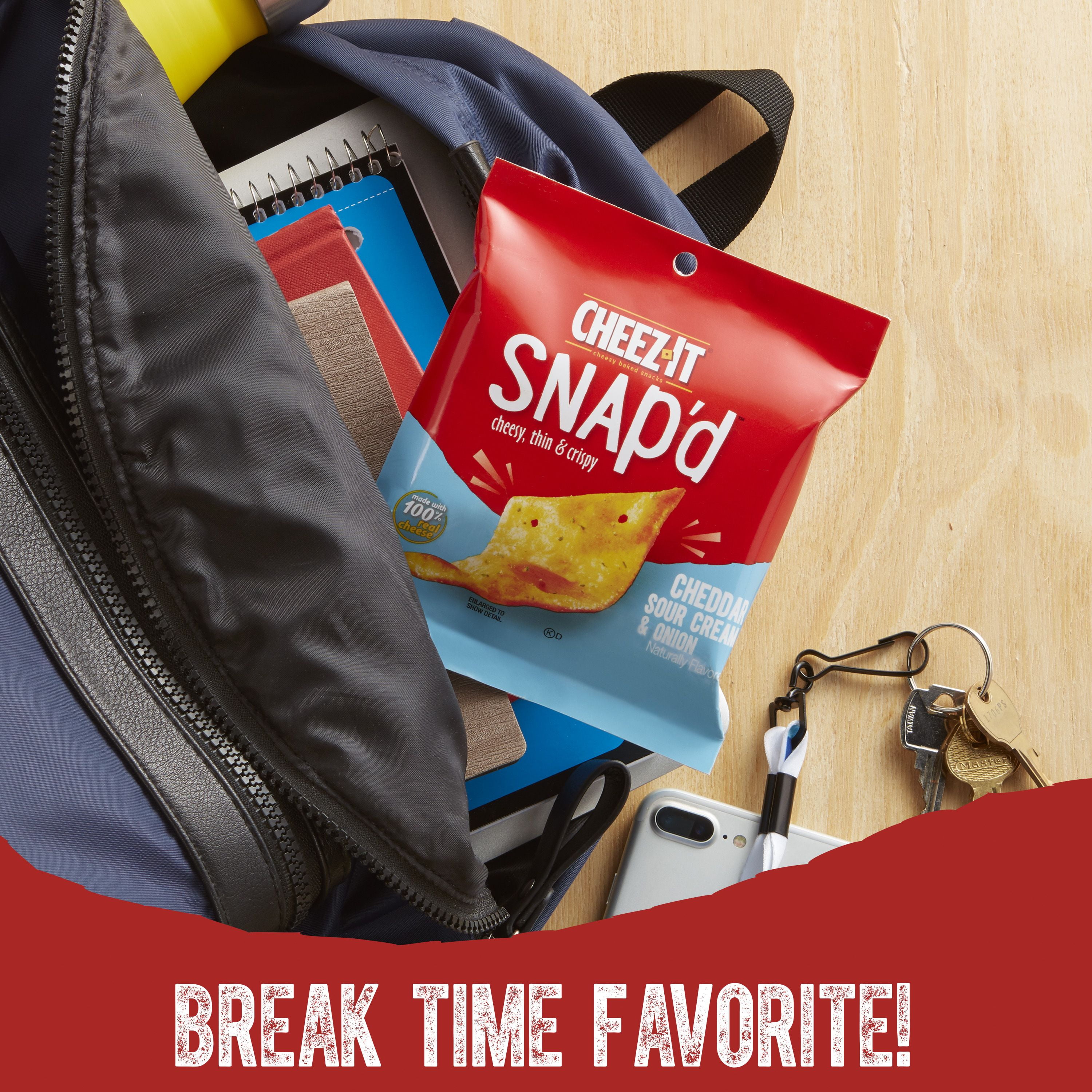 Irresistible cheese? Yes, please. We’ve turned cheesy snacking up a notch with Cheez-It Snap’d Cheddar Sour Cream and Onion Cheesy Baked Snacks. Don’t let these little, thin and crispy snacks fool you. They’re loaded with incredibly big cheese deliciousness. With 100% real cheese baked in, and the satisfying flavor of sour cream and onion, Cheez-It Snap’d crackers give you a deliciously satisfying flavor experience every time. Individually packed for convenience, each pouch makes it easy to enjoy the taste of real cheese during your day. Pack Snap’d crackers for lunch as a flavorful side to your sandwich. Stash them in your child’s school lunch box or snack bag. Get the crunch that you want, plus the tasty flavor of real cheese that you crave, in every perfectly baked bite of Cheez-It Snap’d Cheddar Sour Cream and Onion Baked Snacks Crackers.