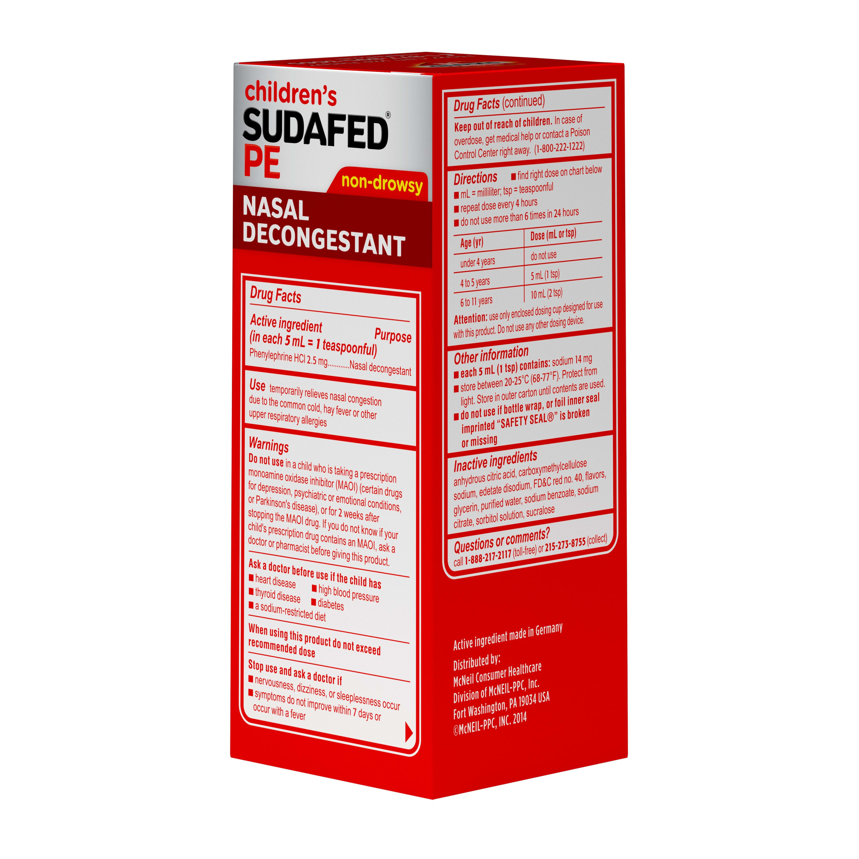 Children’s Sudafed PE Nasal Decongestant provides temporary, non-drowsy cold relief for symptoms of the common cold, hay fever, or other upper respiratory allergies. Each 1-tsp serving contains 2.5 mg of the nasal decongestant phenylephrine HCl. Formulated for children ages 4 to 11, this liquid cold medicine for nasal congestion is alcohol-free and sugar-free. Children’s Sudafed PE Nasal Decongestant has a berry flavor.