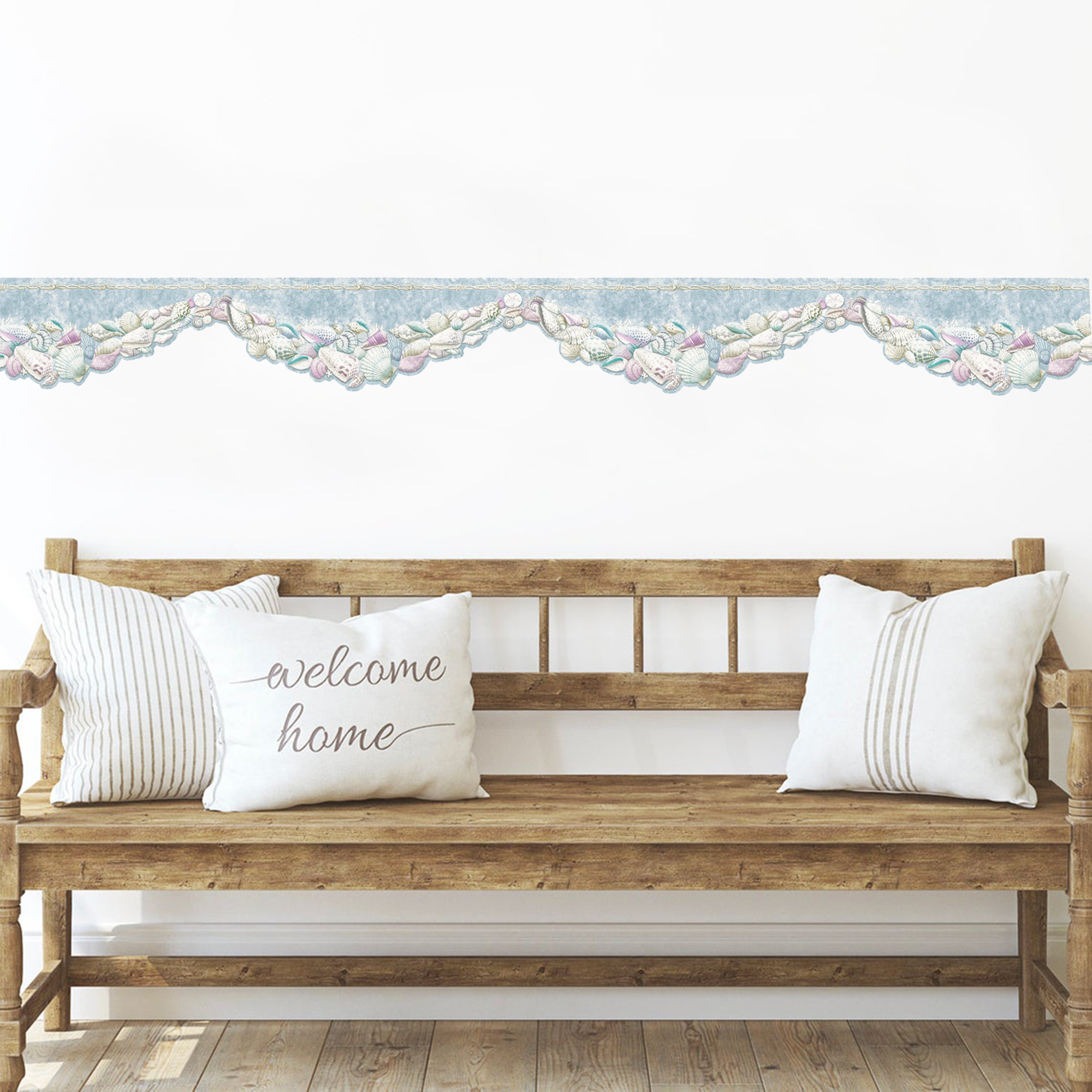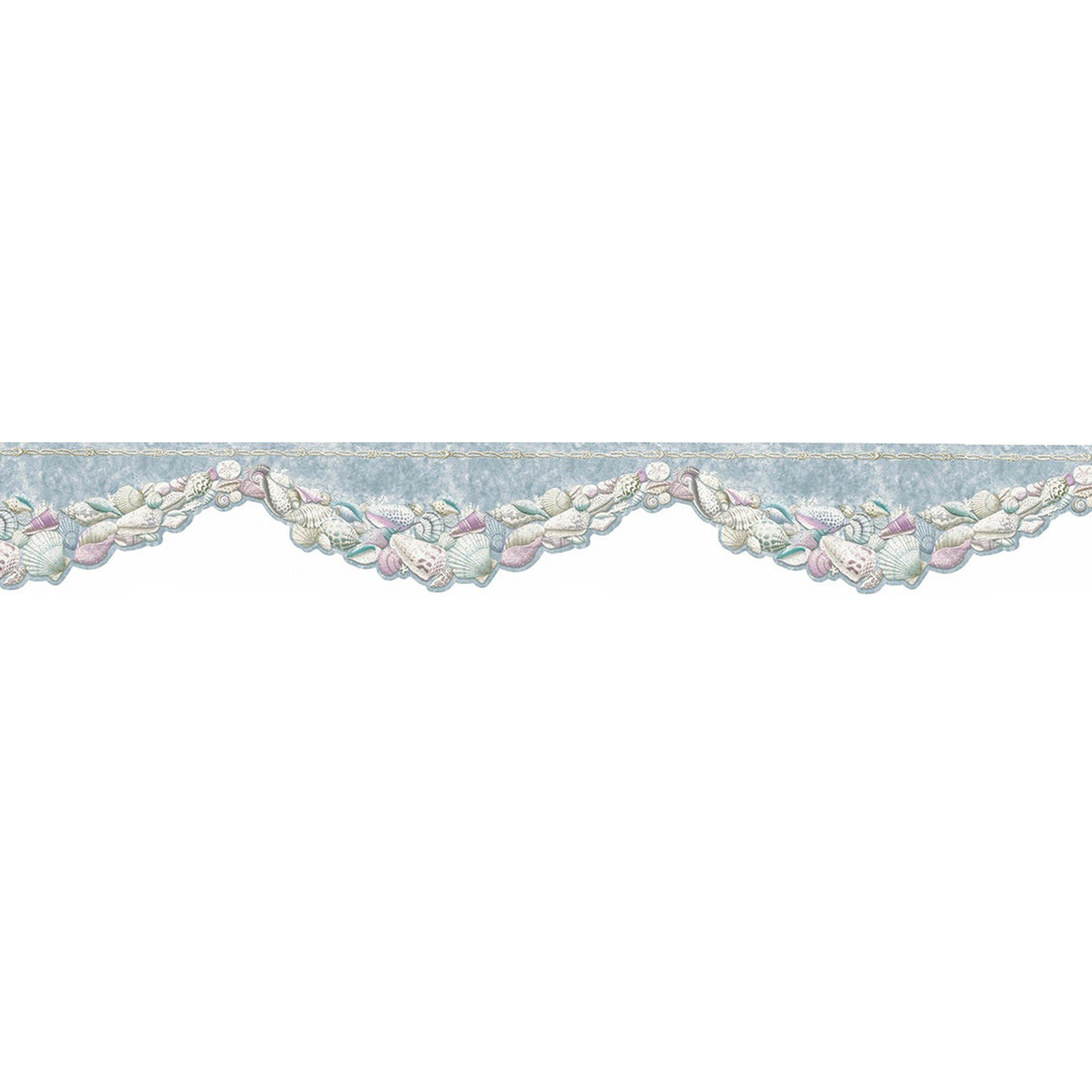 The enchantment of the sea with this Coastal inspired wallpaper border by Cornerstone. Soft cool pale blue ocean tones and a collection of sand dollars, conch shells and assorted sea treasures against a sea form blue background and braided rope ornamental trim. This scalloped seashell nautical themed wallpaper border will look great in any room. Whether you are a beachcomber or just love the ocean this border will remind you of the sea shore . This scalloped design and cool pastel tones bring the sound of the waves and sandy beaches to any space.