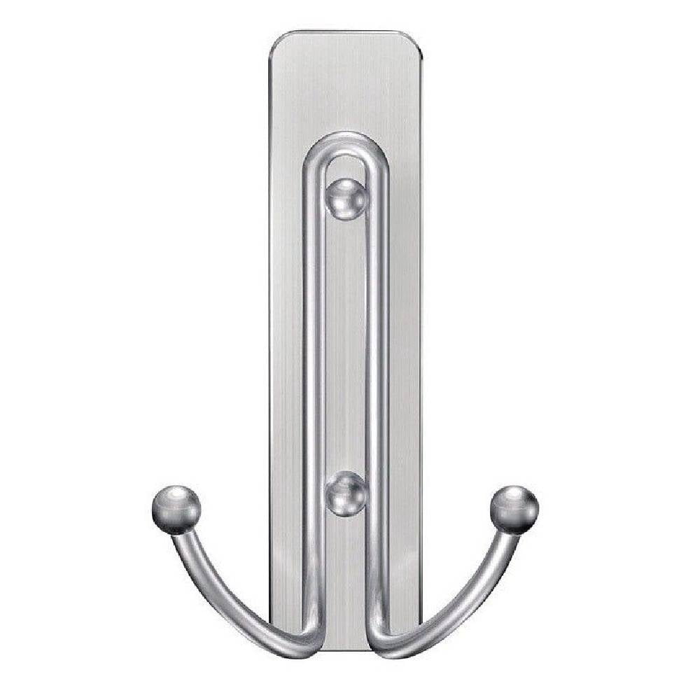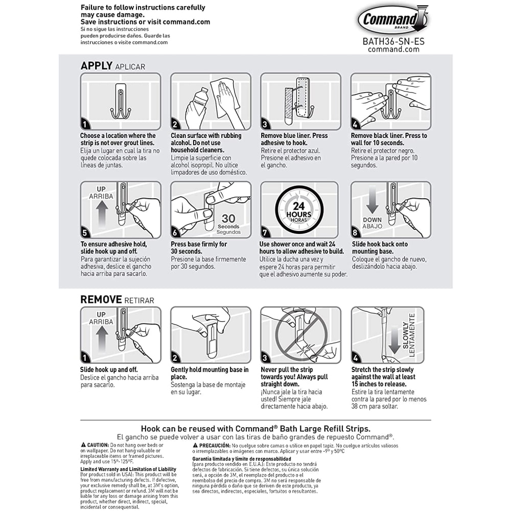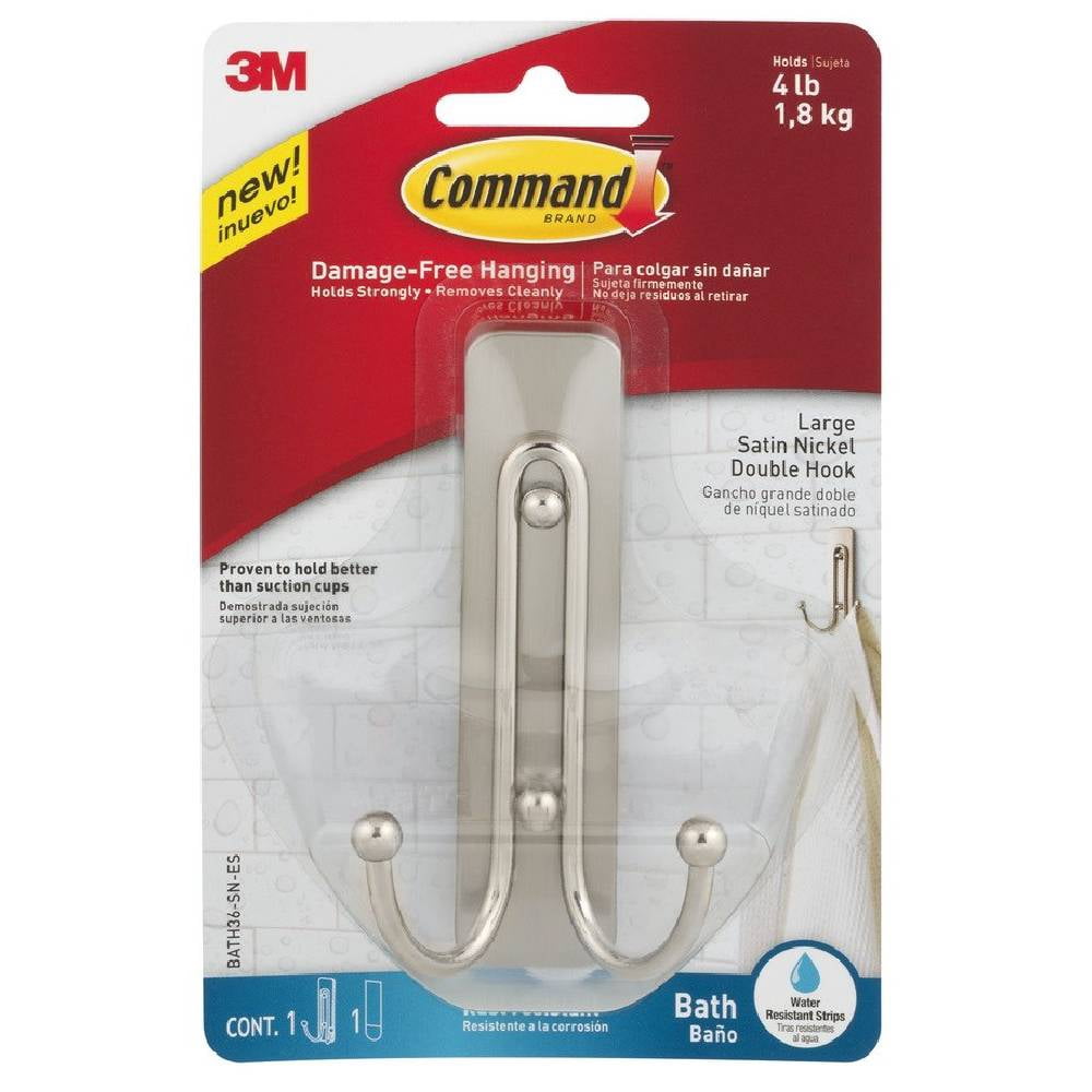 The Command Bath Large Satin Nickel Double Hook with a water-resistant strip allows you to keep your bathroom organized both inside and outside of the shower. The adhesive hook sticks to many surfaces, including glass, mirror, tile, fiberglass, wood and painted surfaces. It adheres firmly and comes off leaving no holes or sticky residue, providing a great alternative to suction cups and damaging screws and nails. Moving the hook for reorganization is as simple as applying a refill, waterproof Command Strip! Holds strongly in wet and humid conditions and is rust resistant. Great for hanging towels and robes in the shower or on the back of the bathroom door.