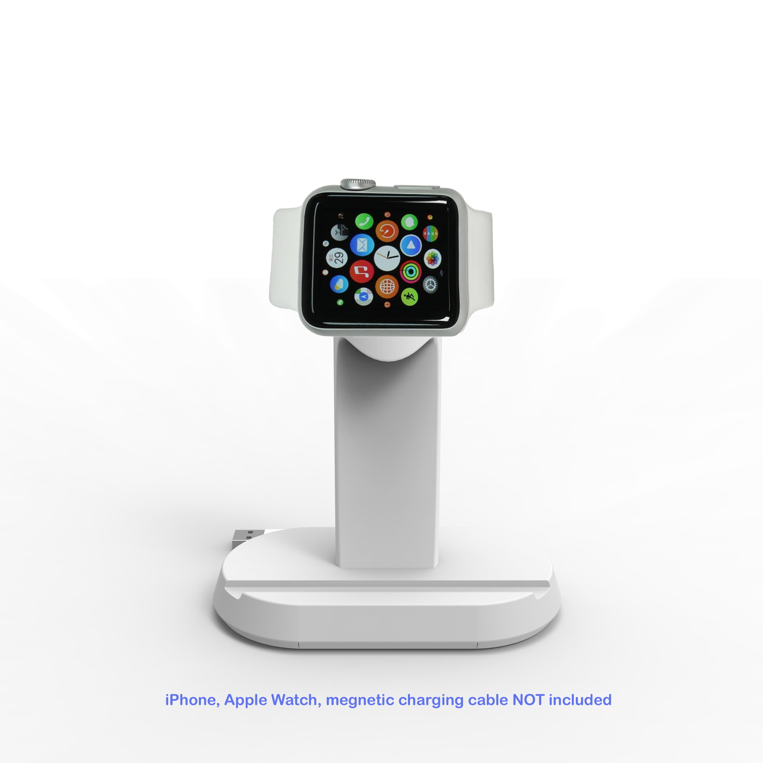 PLEASE NOTE: The Apple Watch, iPhone, Lightning Cable, and the Grommet Charger shown in images are for usage demonstration purposes only, and are not included with this product. - Premium charging stand Special designed for Versions of Apple Watch (Both 38mm and 42mm) & iPhone 4, 4S, 5, 5s, 6, 6 plus.