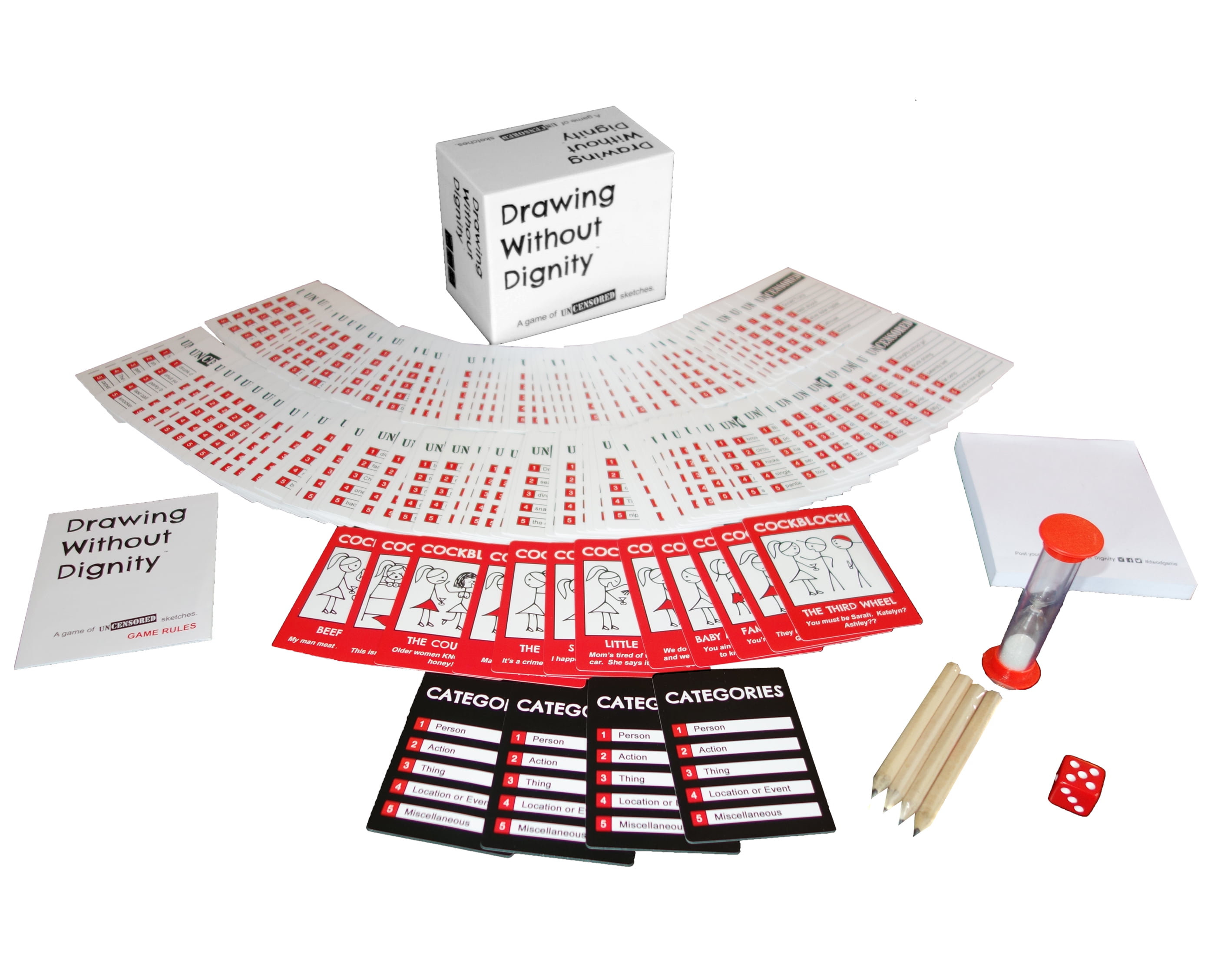 Drawing Without Dignity and Expansion Pack #1 is an uncensored adult party game full of quick sketches and point stealing, an interactive, fun alternative to bring to adult game night.
