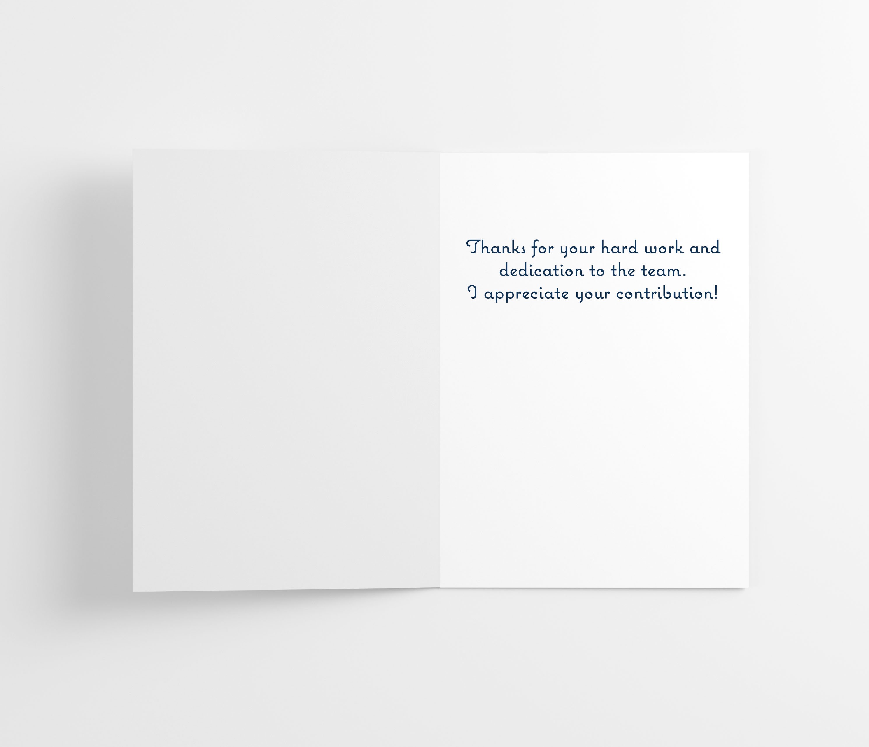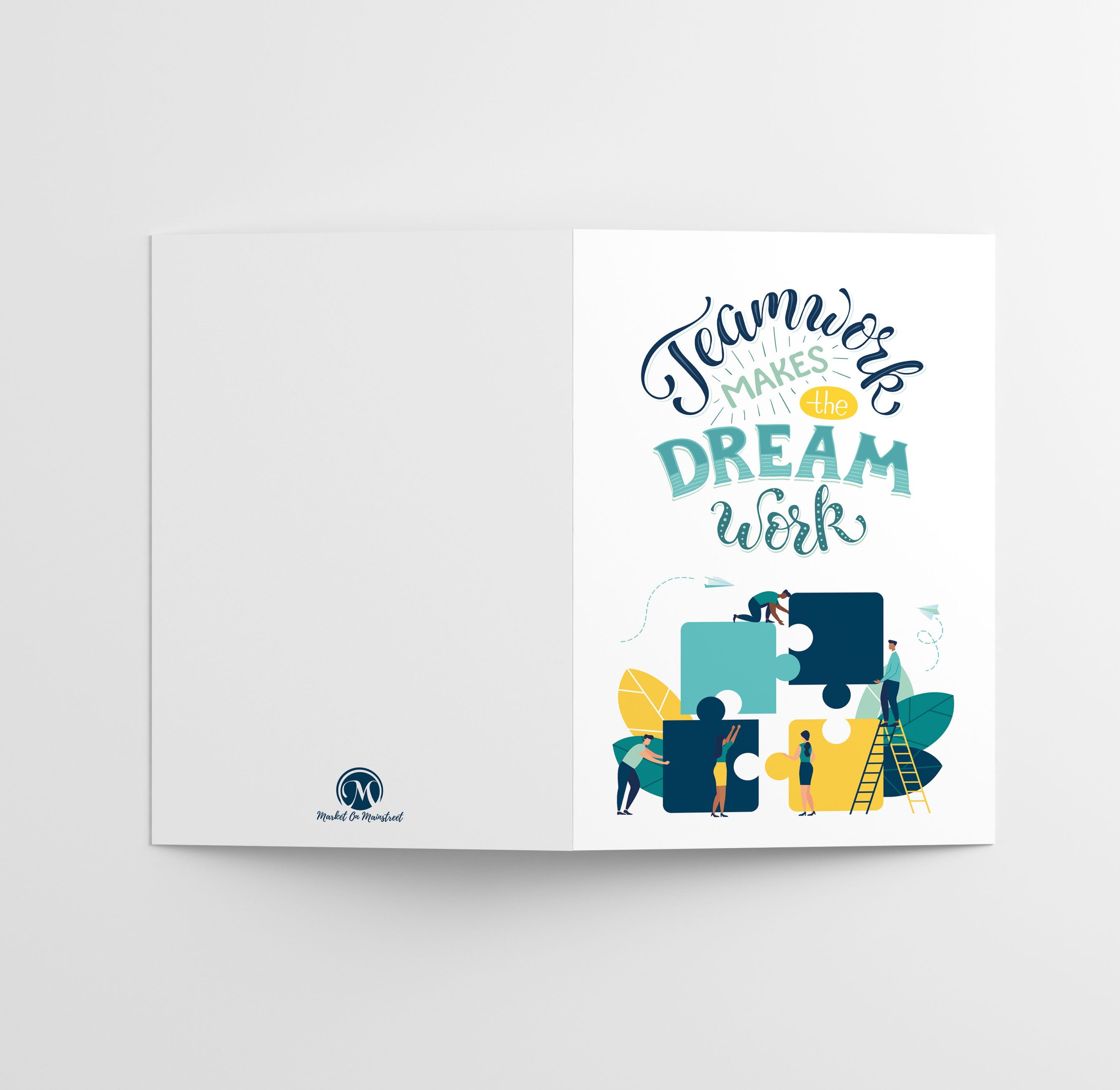 Express your well-deserved gratitude to your employees, co-workers, or team members with this modern and professional thank you card! Cards feature the phrase "Teamwork Makes the Dream Work" across the front. Under the text, a diverse group of people are working together to assemble a 4-piece puzzle. The main colors are turquoise, teal, and mustard yellow. The following message is printed inside: "Thanks for your hard work and dedication to the team. I appreciate your contribution!" Cards come pre-scored and are 4×6 inches when folded. Each package contains 25 cards with white envelopes. Made In The USA by a Small Family Business!