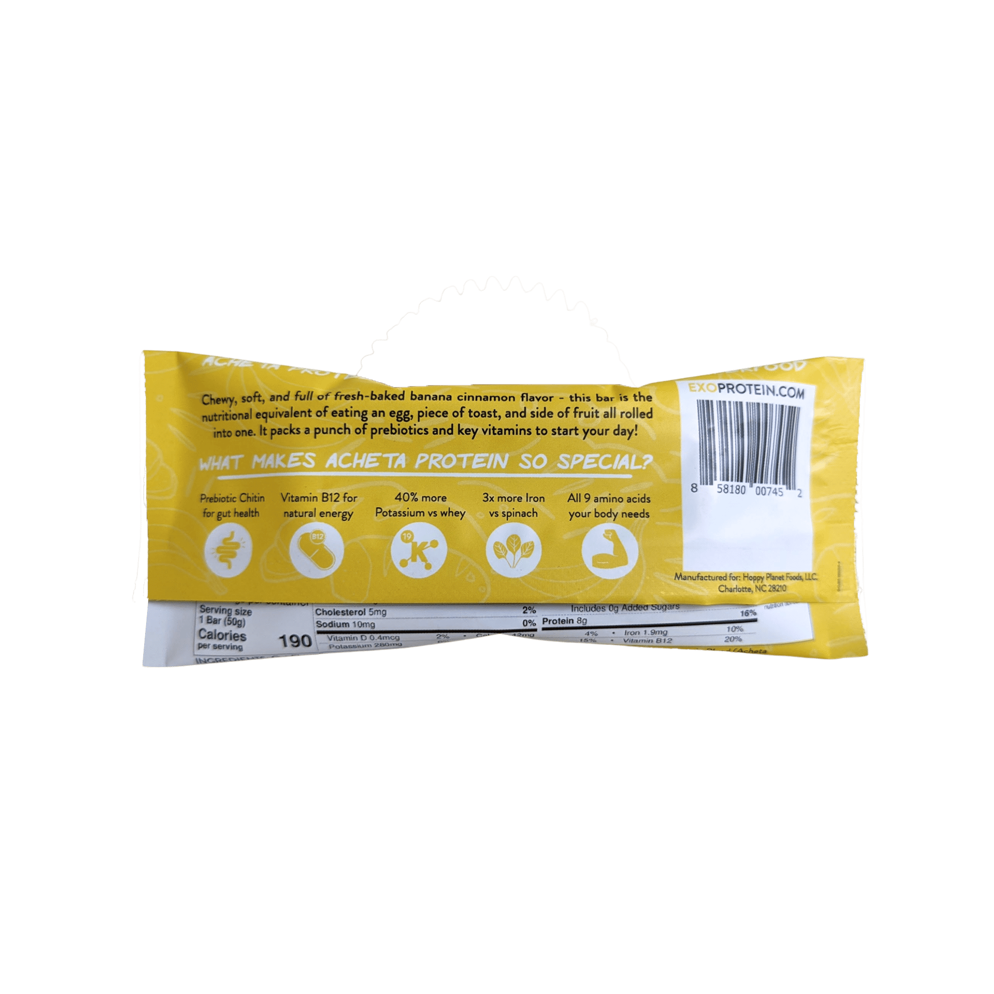 Your Home-Baked Favorite, On-The-Go. Chewy, soft, and full of fresh-baked banana cinnamon flavor EXO’s Banana Bread Prebiotic Breakfast Bar is the nutritional equivalent of eating an egg, piece of toast, and side of fruit all rolled into one. It packs a punch of prebiotics, protein, and vitamins to start your day. Non-GMO, always All-Natural, Dairy-Free, Gluten-Free, and sustainably produced.