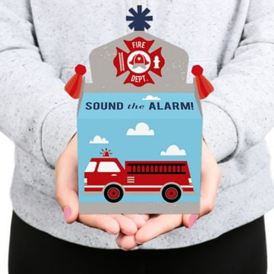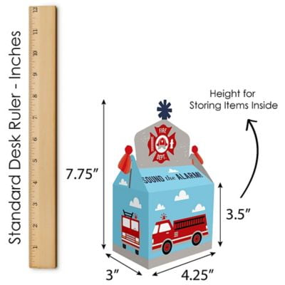 - Gable Boxes INCLUDE: 12 Fired Up Fire Truck-themed goodie party favor boxes. Each box SIZE measures 4.25 inches length x 3 inches width x 7.75 inches height. Gable favor boxes are ideal for small gifts and treats that are under 3.5 inches tall (height for storing items in closed box).