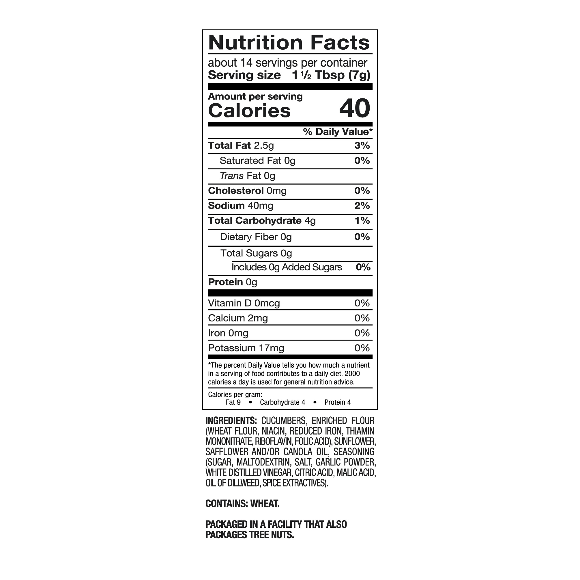 At Fresh Gourmet, We Bring Fresh to Life. Fresh Gourmet Crispy Dillies add an extra flavor and crunch to your favorite salad mix, soup, burger, or casserole. Made with cucumbers and only 40 calories per serving and 0g Sugar, these crispy dillies add that perfect fried pickle flavor to all your favorite dishes. As the No. 1 produce salad toppings brand, the Fresh Gourmet Company has been delighting consumers with complementary products such as croutons, crispy vegetables, cheese crisps, tortilla strips and fruit and nut items for over 25 years.