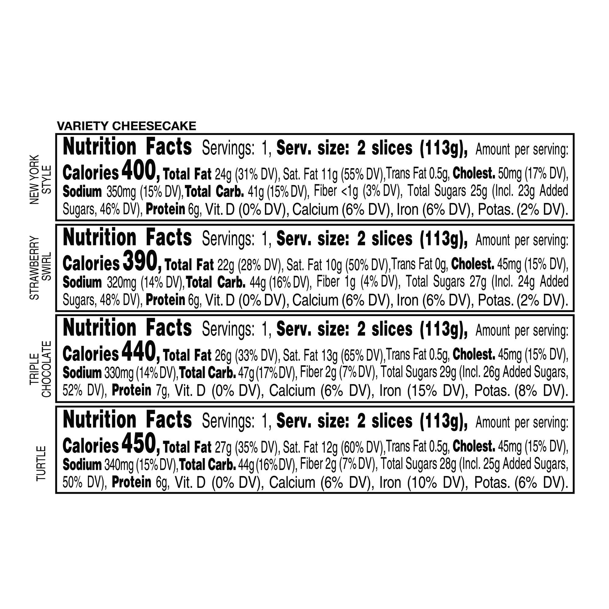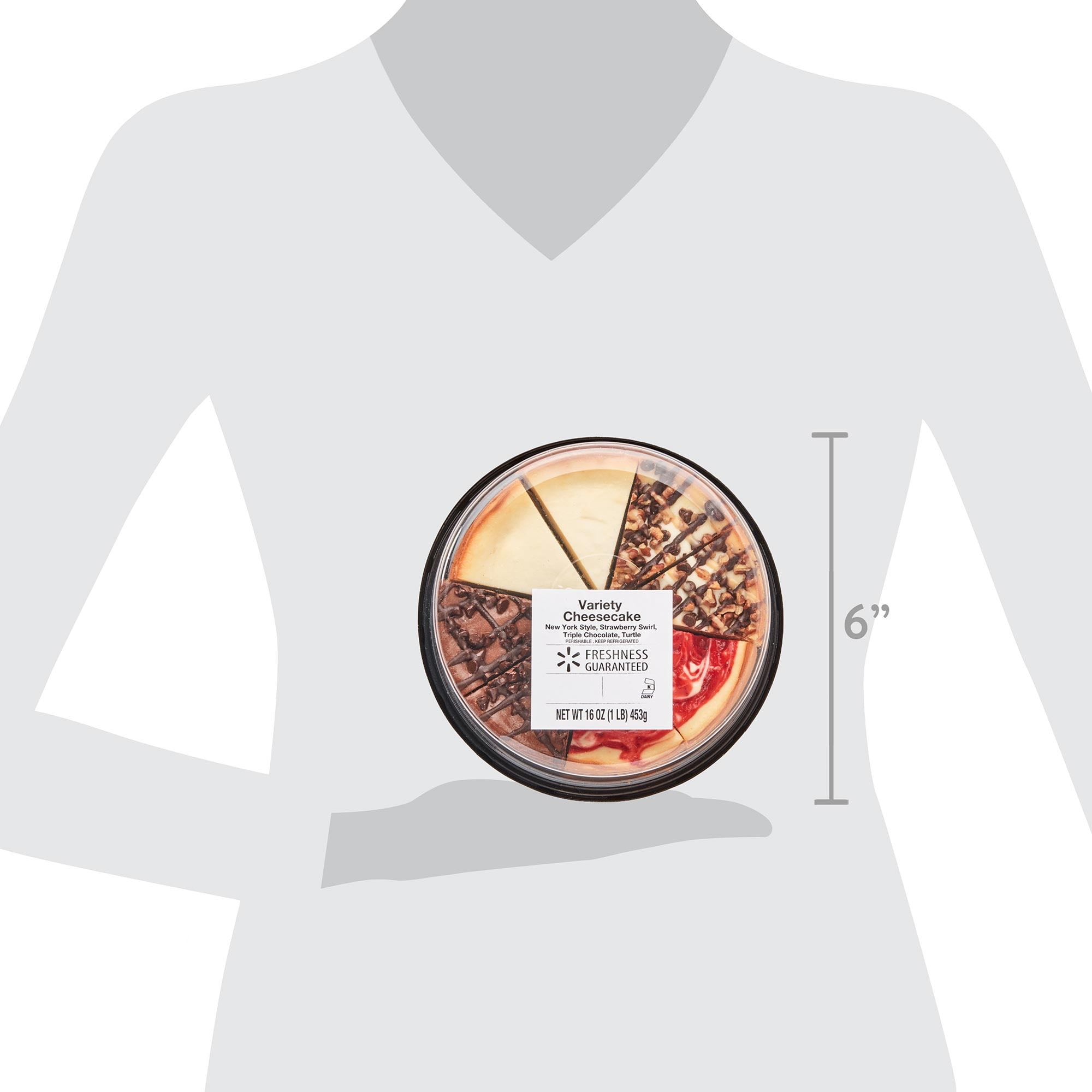 Indulge in the decadent flavors of Freshness Guaranteed Variety Cheesecake. With a variety of different flavors, this cheesecake sampler is sure to have something everyone would like. Choose from strawberry swirl, turtle pecan, triple chocolate, and New York style. Enjoy them as an after-dinner treat, share with a friend, or indulge on them as a decadent sweet snack. Try pairing them with a hot cup of coffee or a tall glass of cold milk. Containing a eight slices, you’ll have plenty to choose from and share with your family and friends. Pick up the Freshness Guaranteed Variety Cheesecake today.Freshness Guaranteed provides you and your family with high-quality fresh food that saves you time and money, many of which are cooked fresh or prepared in stores. Convenient solutions with value added in every Freshness Guaranteed item.Freshness Guaranteed Variety Cheesecake, 16 oz: