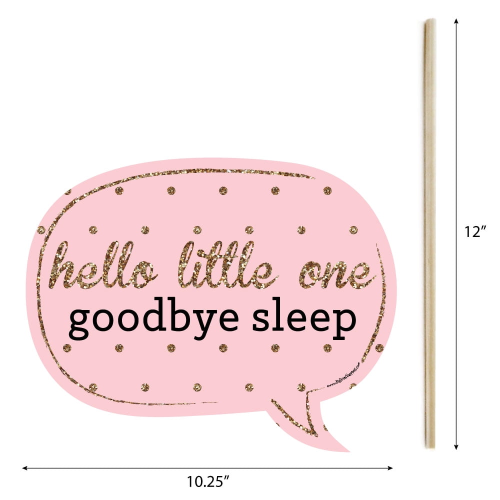 - 10-Piece Funny Hello Little One Photo Booth Props Kit INCLUDES 10 Pink and Gold arrow and speech bubble photo booth props, 10 wooden dowel sticks and adhesives for assembly. EASY ASSEMBLY: Simply attach the printed DIY photo booth props to the wooden dowels with included adhesive and reinforcing stickers.