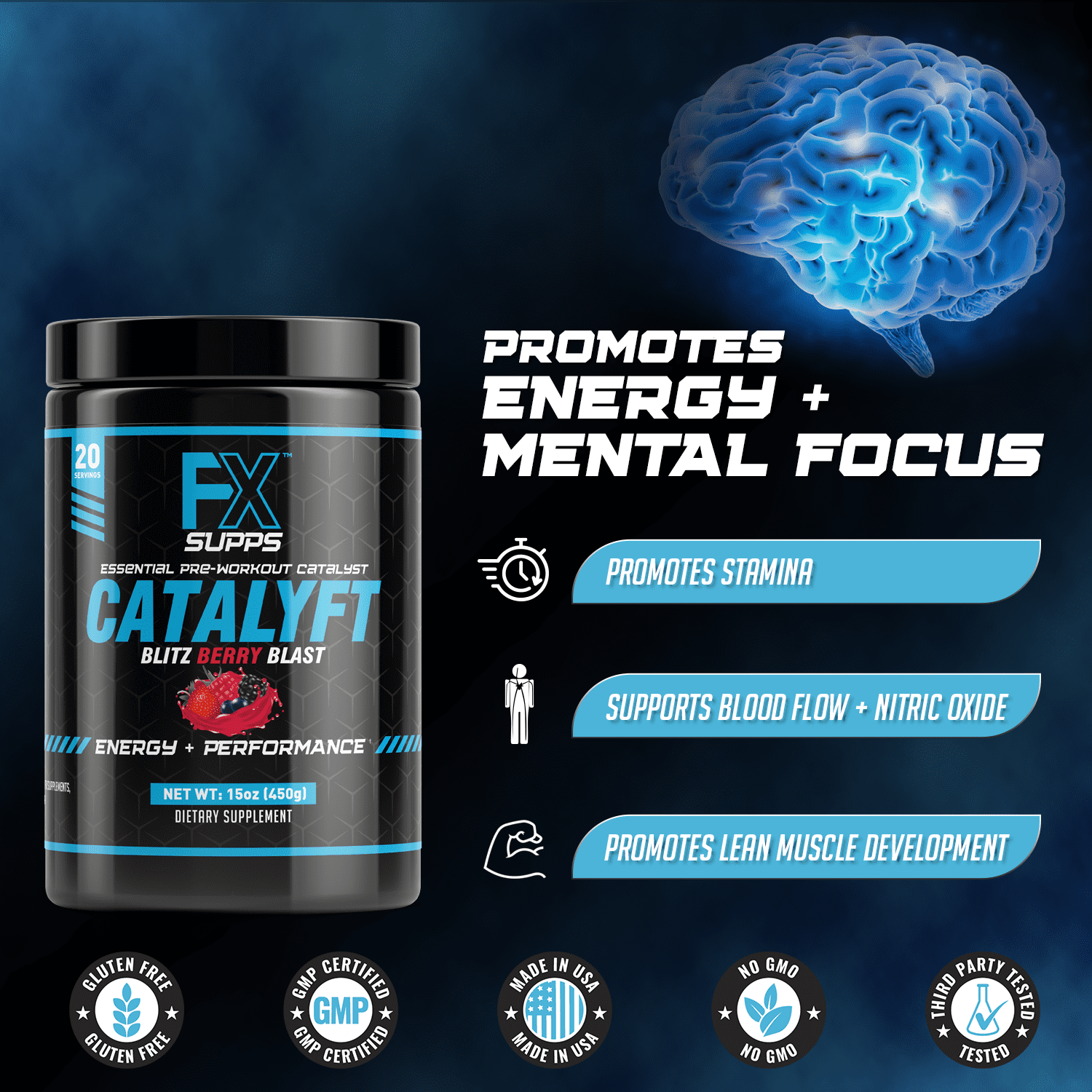 - POWER UP YOUR PRE-WORKOUT: FX Supplements Pre-workout muscle pump supplement gives you the energy and focuses to perform. Catalyft provides you the aid required to increase strength and muscles pumps allowing you to lift heavier, run further faster and surpass your regular physical performance, it directly leads to increases strength gains and muscle development.