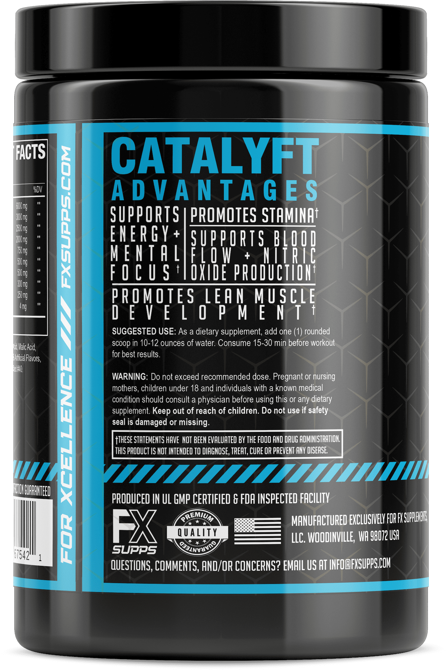 Catalyft is FX Supplements essential pre-workout energy supplement and main stitch in our products. Our pre-workout powder is an authentic and transparent label, which means no proprietary blends or fillers. The product is fast-acting with an instant body reaction with the product coming in with about 250 mg of caffeine. . Our Catalyft pre-workout supplement is a rich source of nutrition that gives you unsurpassed energy to fuel your workouts to achieve the next level without the crash. Catalyft provides a perfect balance of endurance, strength, focus, and energy. KEY FEATURES: •Improves athletic endurance •Promotes blood circulation for optimal pump •Increases strength gains and muscle development