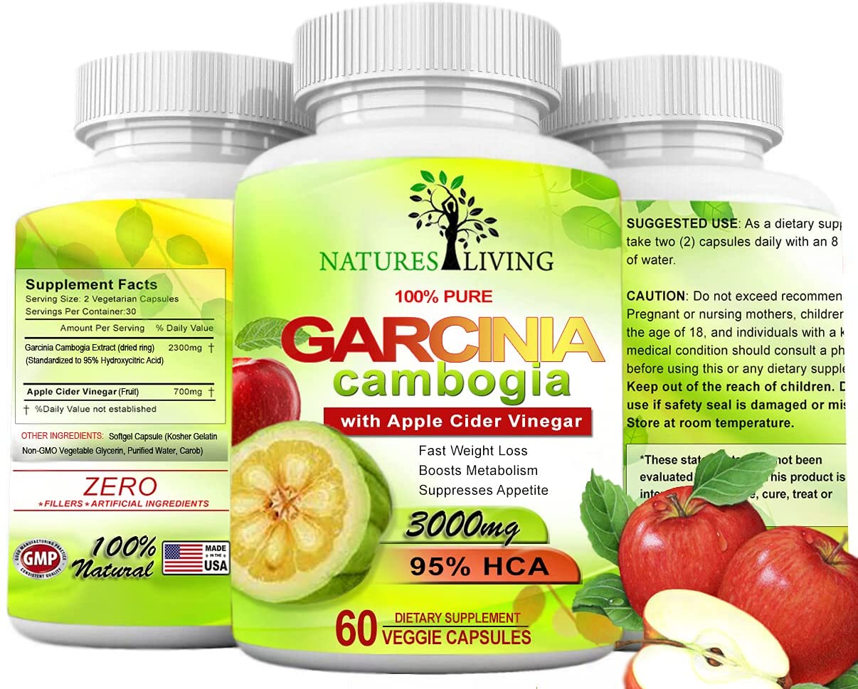 Natures Living Garcinia Cambogia 95% HCA & Apple Cider Vinegar 3000mg 180 Veggie Capsules – Herbal Weight Loss Supplement (60 Capsules in each Bottle) 3 Bottles Included