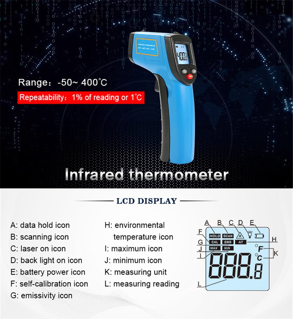 About this item✔✔【High Accuracy】:The infrared thermometer has object distance of 12:1 and can measure targets at a longer distance. High quality sensors can be used to complete measurements in 0.5 seconds. Measurement accuracy up to ±1.5°C/±1.5 %, More accurate measurement target than most digital thermometers .which is suitable for most daily life.✔✔【Widely Used】: Temp measurement range -50 ~ 400 ° C (-58 ~ 752 ° F), laser thermometer can be used for hot Water and Oil in life, Kitchen Cooking,Food Meat,Oven,Automobile repair, Engine, Tlectrical equipment and more✔✔【Unique Features】:IR thermometer mode switch button to switch between MAX/MIN/AT/EMS/CAL Mode,More modes but simpler operation, and can make measurements more accurate than most other infrared thermometer✔✔【Operation Display】:Laser thermometer adopts large LCD display with high stability and backlit display, which can read values in the dark; no need for power switch, just press the measurement buttonGM321 Laser Infrared Thermometer Non-Contact Digital Industrial Thermometer,Adjustable Emissivity -58°F~752°F(-50°C~400°C) IR Thermometer for Industrial,Kitchen Cooking,Ovens (Not for Human Body)