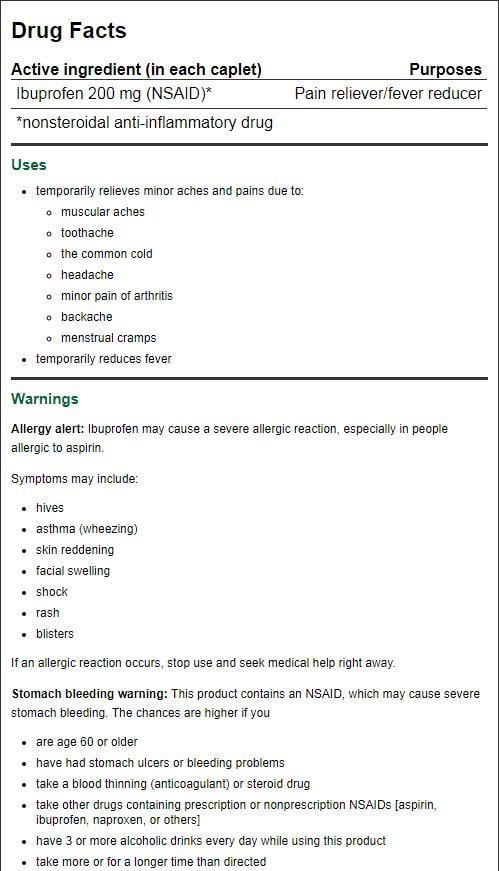 Ibuprofen from Good Sense temporarily relieves minor aches and pains due to muscular aches, toothache, the common cold, headache, minor pain of arthritis and menstrual cramps. Each caplet contains 200 mg of ibuprofen NSAID (nonsteroidal anti-inflammatory drug). Compare to the active ingredient of Advil Ibuprofen Caplets.