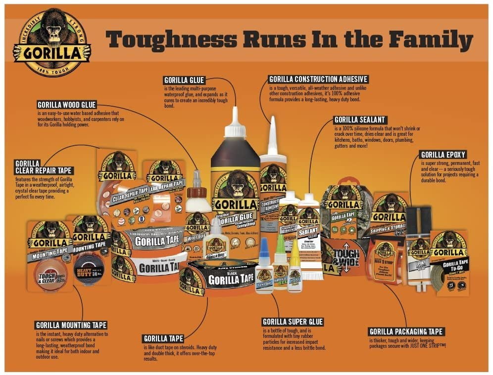 Gorilla Tape has taken duct tape to a new level. This double thick adhesive tape surpasses ordinary duct tapes, making the list of uses virtually endless. Made with double thick adhesive, strong reinforced backing, and a tough all-weather shell, its the biggest, strongest, toughest thing ever to happen to duct tape. Gorilla Tape is manufactured with a highly concentrated rubber based adhesive two to three times as thick as traditional duct tape. The result is a tape that fills gaps and penetrates rough surfaces. It sticks to rough and uneven surfaces, including wood, stone, stucco and brick, that ordinary duct tapes can’t hold. To us, its made the way tape should be: The Toughest on Planet Earth. Directions: Use like any other tape. Tear Gorilla Tape by hand or cut to size with a knife or scissors. It is important to clean the surface and brush off any loose particles and dirt before applying Gorilla Tape. Apply the tape carefully, smoothing out any pockets or rolls. Thats it. Enjoy the strength and durability of Gorilla Tape! To retain adhesive quality, store Gorilla Tape in a cool, dry place. Keep out of direct sunlight. Try storing the tape vertically rather than lying flat, on a hook or on wax paper. If you have multiple rolls, keep your excess supply wrapped until theyre needed. Gorilla Tape works best at temperatures above 32F 0C. For best results, always apply the tape at room temperature. If Gorilla Tape freezes, it will work just fine once it returns to room temperature. Gorilla Tape can be removed, but with some difficulty and it may leave some residue. To remove any excess residue, we recommend using the tape itself as a blotter. Gorilla Tape should not be used as an electrical tape. Weve found that Gorilla Tape will last a lot longer than regular duct tapes when it comes in contact with moisture. Click on the Gorilla link at the top of this page to see other quality products from the Gorilla Glue Company.