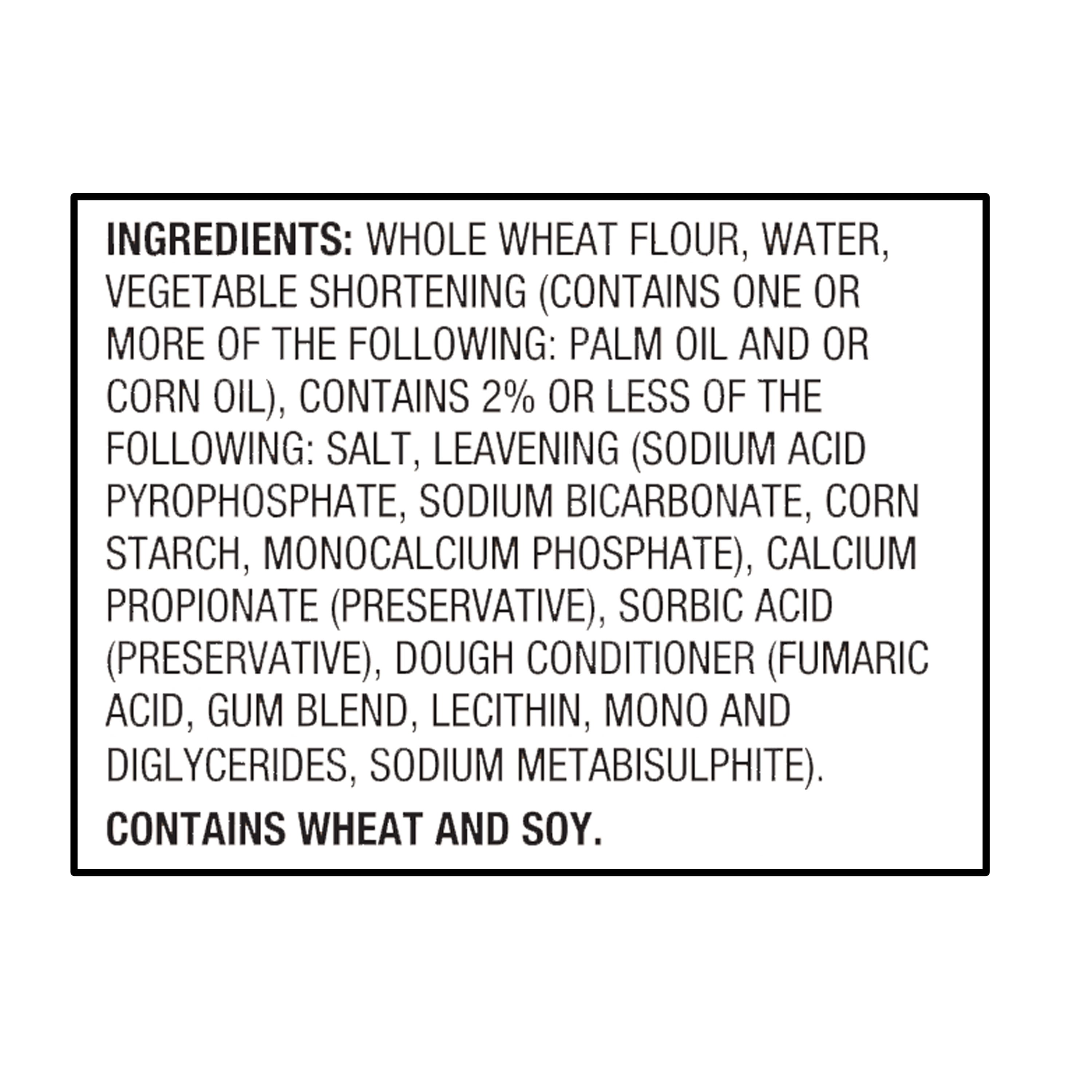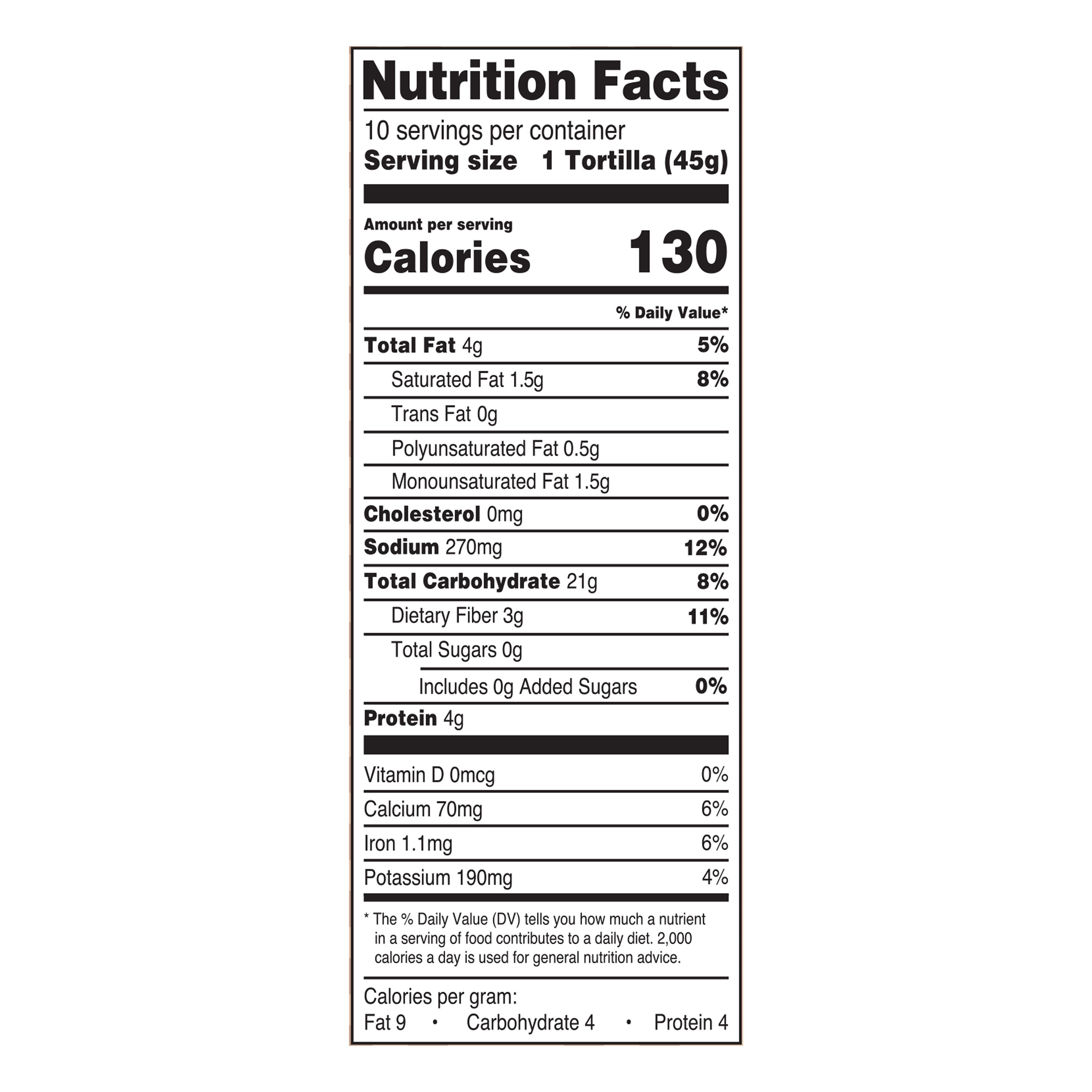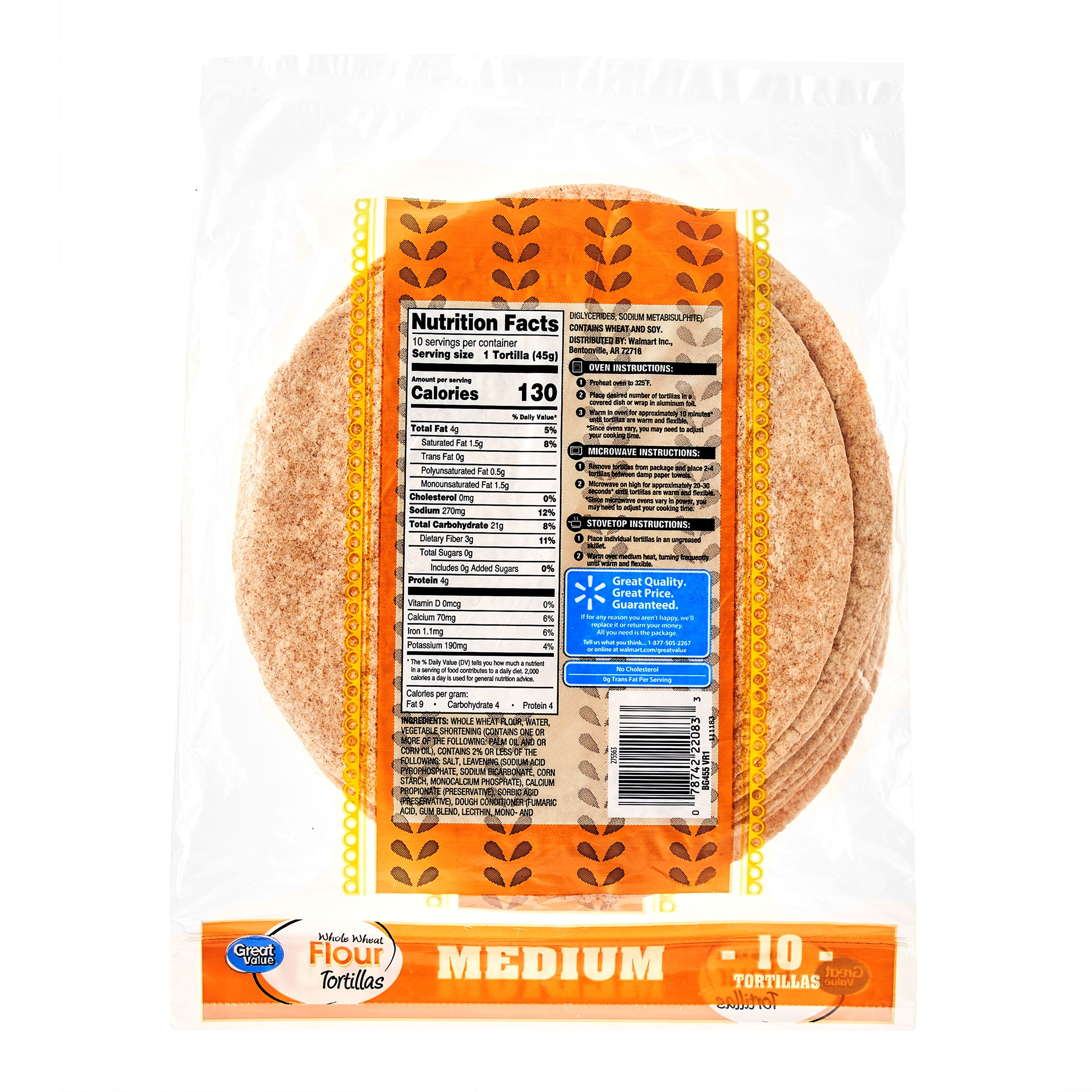 Great Value Medium Whole Wheat Flour Tortillas are a delicious addition to any meal. Our whole wheat flour tortillas have a light, fluffy texture and are rich with flavor. Make traditional tacos filled with your choice of meat, refried beans, shredded cheese, lettuce, tomato, onion, sour cream, and guacamole. Use them to make homemade chicken Caesar salad wraps with freshly grilled chicken, parmesan cheese, and crispy romaine lettuce. Cook up a tasty breakfast burrito with scrambled eggs, onions, jalapenos, sour cream, and sausage. However you choose to use them, the entire family will enjoy Great Value Medium Whole Wheat Flour Tortillas.