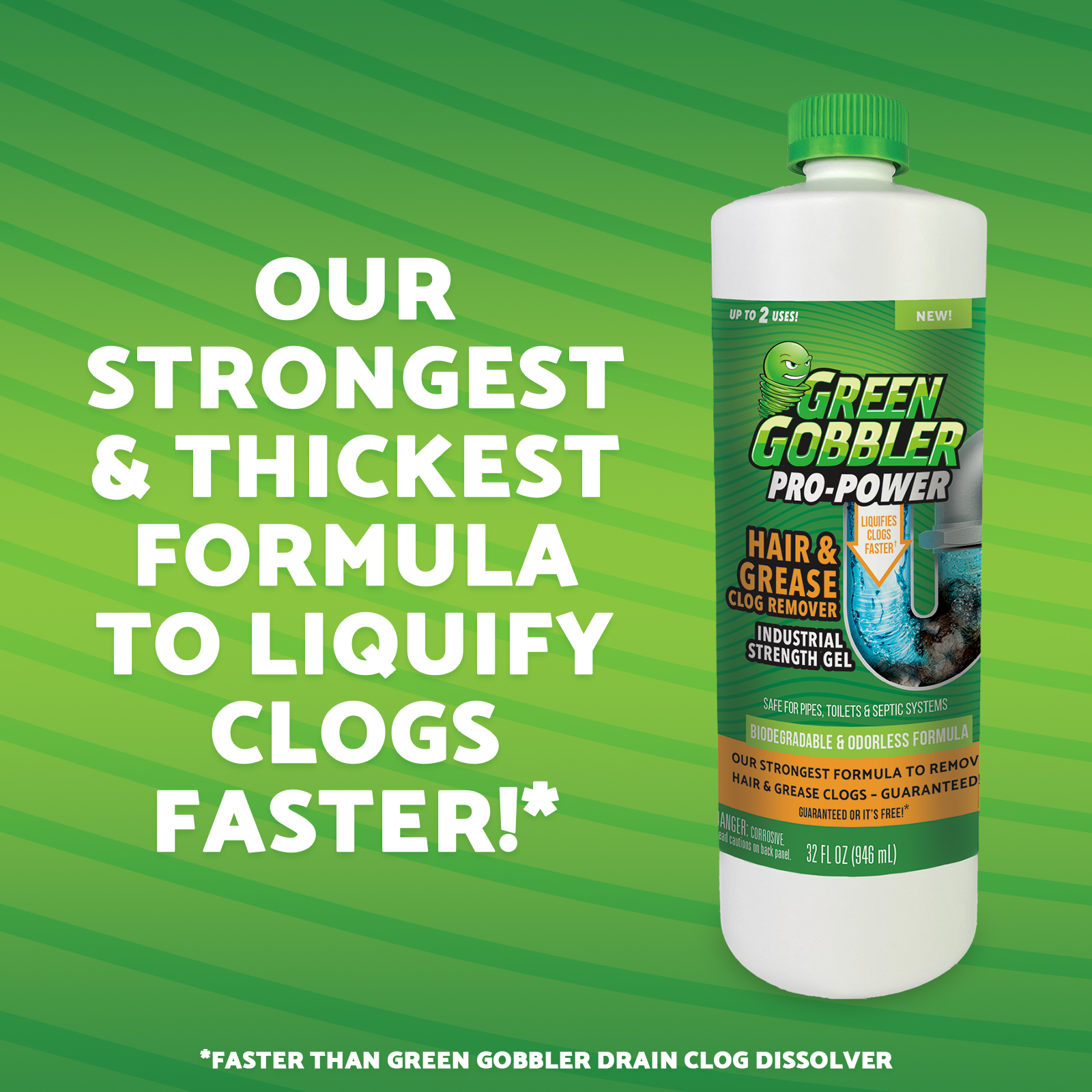 Meet our strongest clog remover & drain opener from Green Gobbler! Our Pro-Power formula effectively dissolves grease with proprietary combination of alkalinity & surfactants. It pours through standing water and is a 3X thicker gel formula than our dissolver formula to cling to clogs better. This tough formula is safe for pipes, septic, and for use in toilets, sinks, showers, and tubs. Environmentally friendly; biodegradable formula with surfactants derived from natural sources. Fume-Free! This product is free of harsh odors and is easy to use. Break through the toughest, most stubborn clogs with Green Gobbler Pro-Power Grease and Hair Clog Remover Industrial Strength Gel!