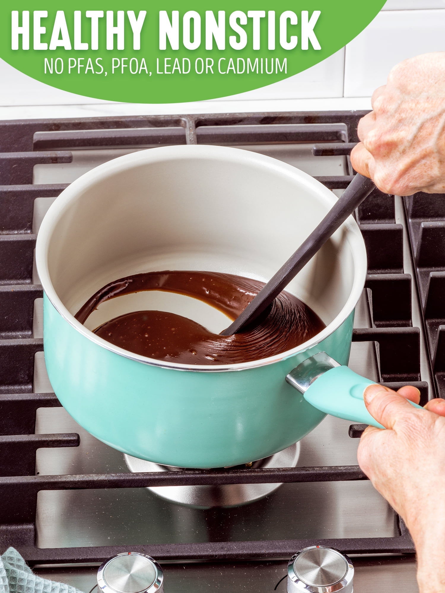- This 2.5 Quart Sauce Pan has Diamond-infused Sandstone ceramic nonstick coating that is derived from sand and free of PFAS, PFOA, lead, and cadmium for effortless cooking and quick cleanup.