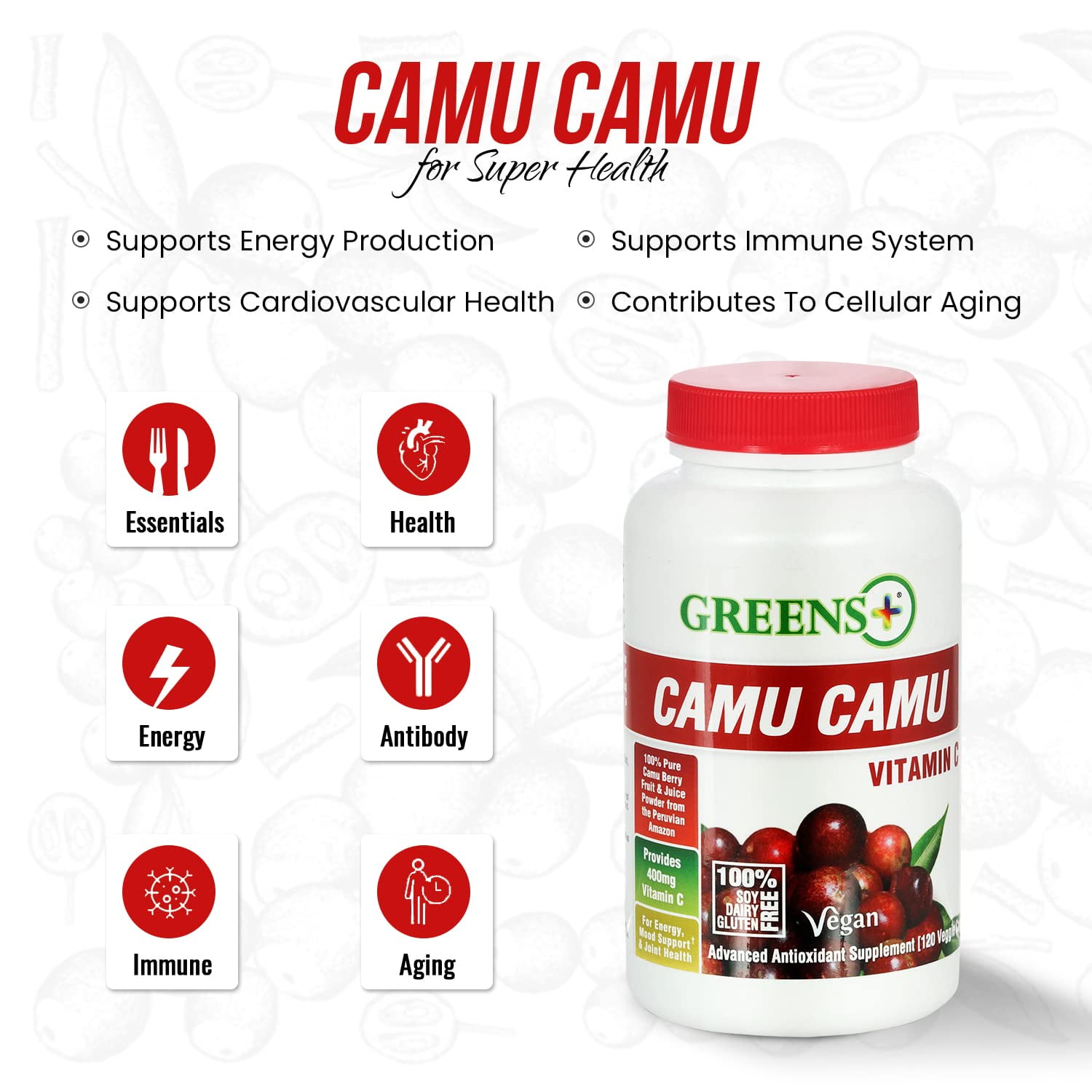 Camu Camu contains the highest concentration of natural Vitamin C, with 15% Ascorbic Acid and over 70 synergistic antioxidants, essential minerals and amino acids, including Calcium, Potassium, Phosphorus, Beta–carotene, Alanine, Phenylalanine, Serine, and Ellagic, Citric and Malic Acids. Greens Plus Camu Camu Capsules contain 100% pure camu berry fruit and juice powder On customer Demand. Camu Camu has the highest concentration of natural Vitamin C. Camu Camu contains 15% Ascorbic Acid. Ascorbic Acid is considered, by nutrition scientists, to be the single most important vitamin required for human health. Almost all organisms can synthesize their own Vitamin C from glucose. • Over 70 synergistic antioxidants essential minerals and amino acids including o Calcium o Potassium o Phosphorus o Beta–carotene o Alanine o Phenylalanine o Serine o Ellagic, Citric and Malic Acids. These synergistic phytonutrients combine to deliver a massive 110,807 Total ORAC units per serving.