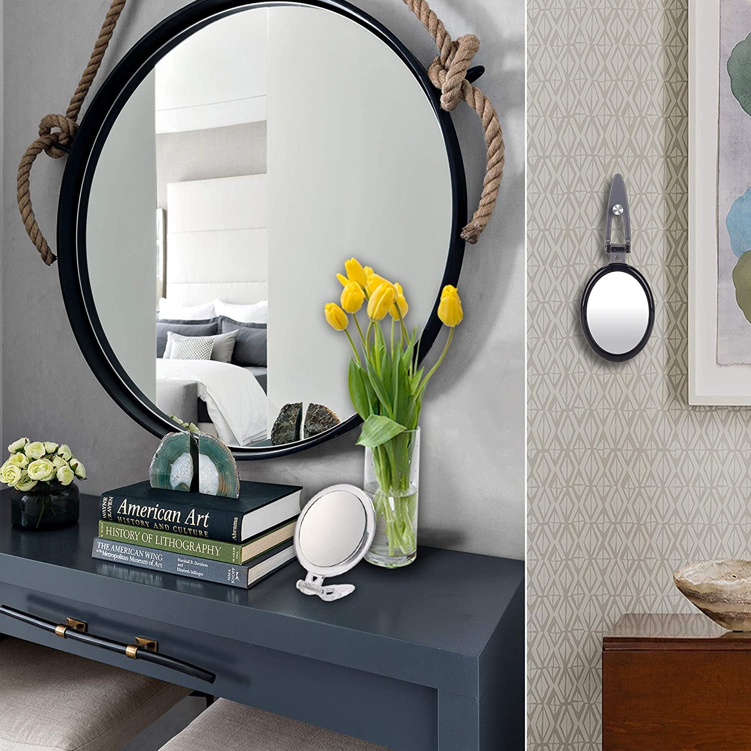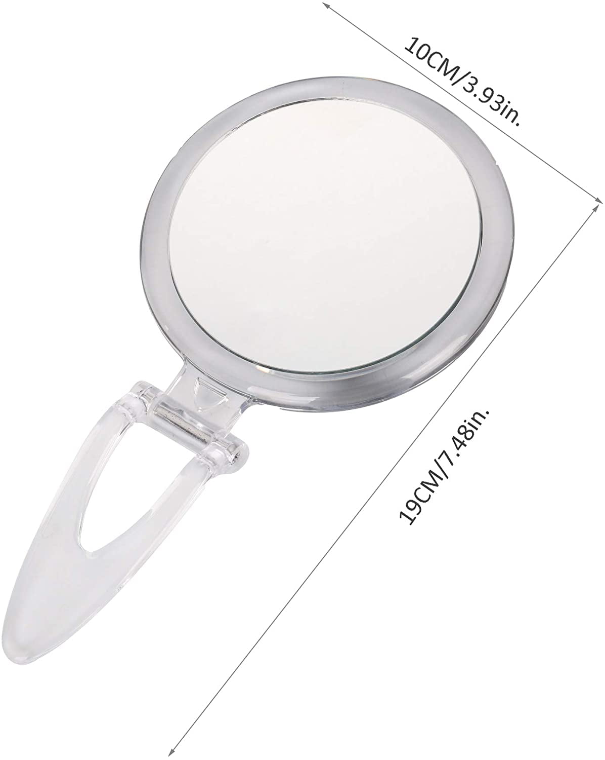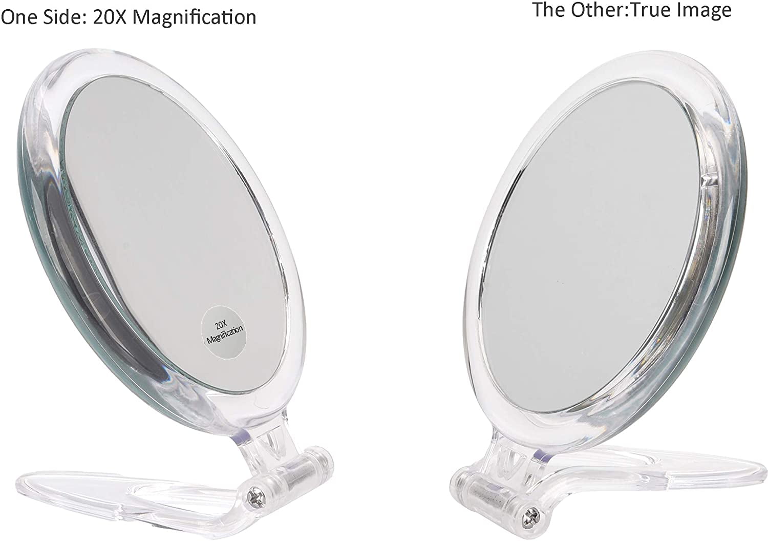 Magnifying makeup mirror with 20x magnification,made with optical quality glass; 5Inches round. Our this magnifying hand mirror with adjustable handle easily converts 3 ways – handheld, hang, or fold into a stand, so you can use the mirror on any surface.