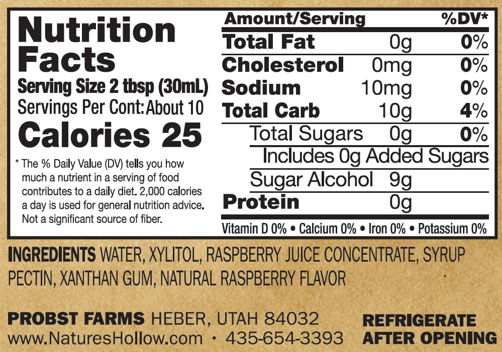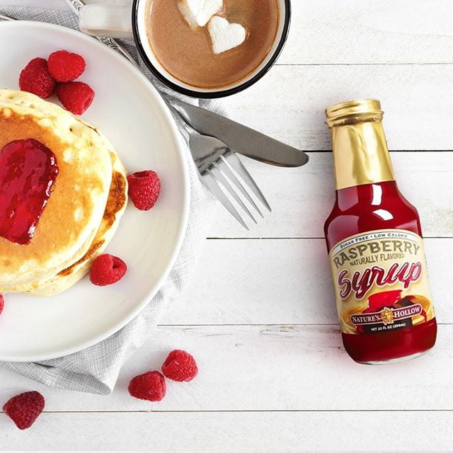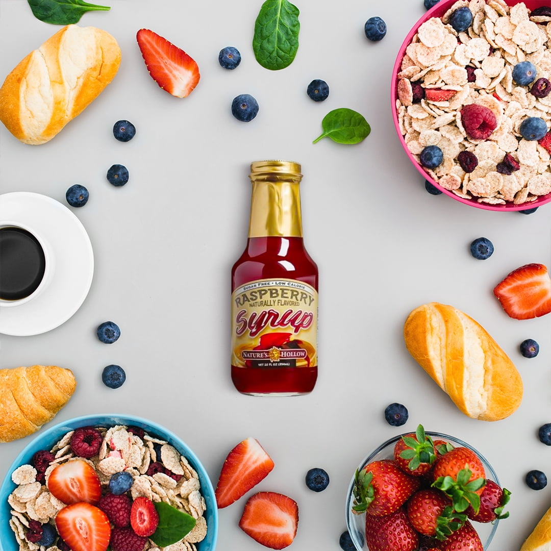 Sugar Free Raspberry Syrup by Nature’s Hollow 10 fl oz Liquid Sugar Free Raspberry Syrup 10 fl oz Liquid Nature’s Hollow sugar free raspberry pancake syrup is made with a great tasting healthful natural sweetener called Xylitol. Xylitol is a 5-carbon sugar alcohol that is ideal for diabetics and those concerned about sugar intake. Unlike sugar Xylitol has a very low glycemic index has fewer calories and is good for your teeth. Whether you choose maple syrup or raspberry syrup this will be the best tasting sugar free diet syrup product you have ever tasted. Taste the difference and you will never go back to artificial sweeteners again. Supplement Facts Serving Size 1 4 Cup (60ml) Servings Per Container About 4 Amount Per Serving Daily Value Calories 57 Calories From Fat 0 Total Fat 0g 0 Sodium 0g 0 Total Carb 20g 0 Effective Carbs 2g Sugars 0g Protein 0g Sugar Alcohol 18g Percent Daily Values are based on a 2 000 calorie diet Other Ingredients Spring Water Xylitol Raspberry Juice Xanth• 75% fewer calories than the leading flavored syrups