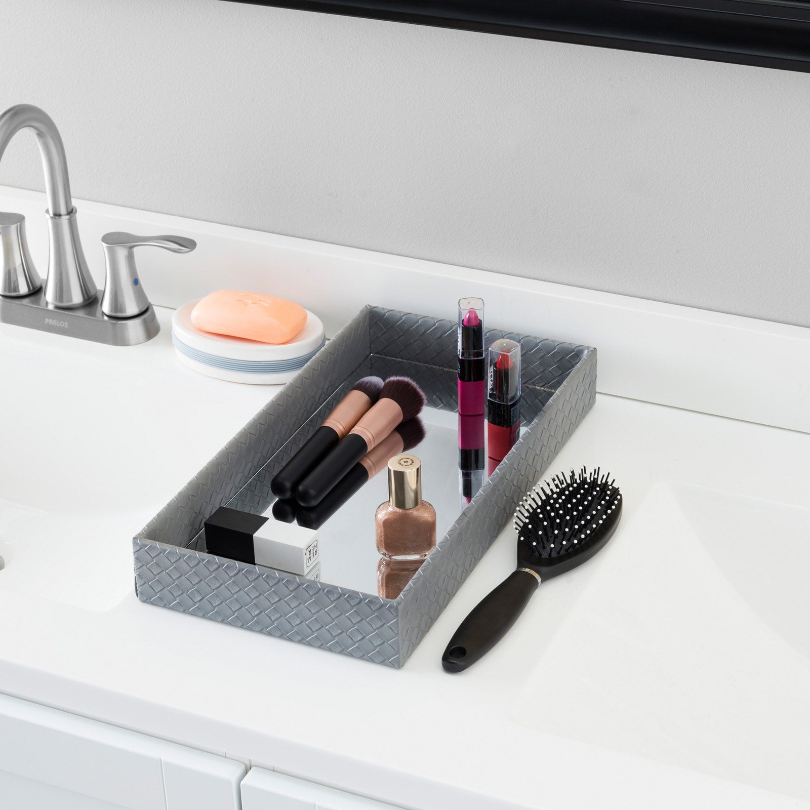 With its faux leather woven design, the Home Basics Mirrored Leather Vanity Tray makes a chic and modern complement to your dresser, vanity, or tabletop. The gray border is complemented by a mirrored bottom. Use this vanity tray to store and display cosmetics, toiletries, and more.