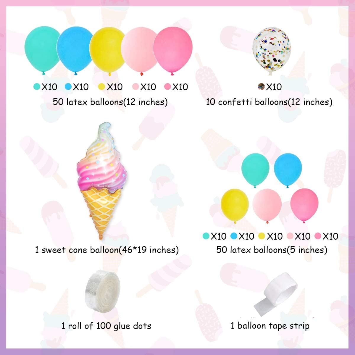 - ALL-IN-ON ICE CREAM BALLOON GARLAND: 100 latex balloons, 10 confetti balloons, 1 ice cream foil balloon, 1 roll balloon tape strip(110 holes), 1 roll balloon adhesive dot (including 100 dots).